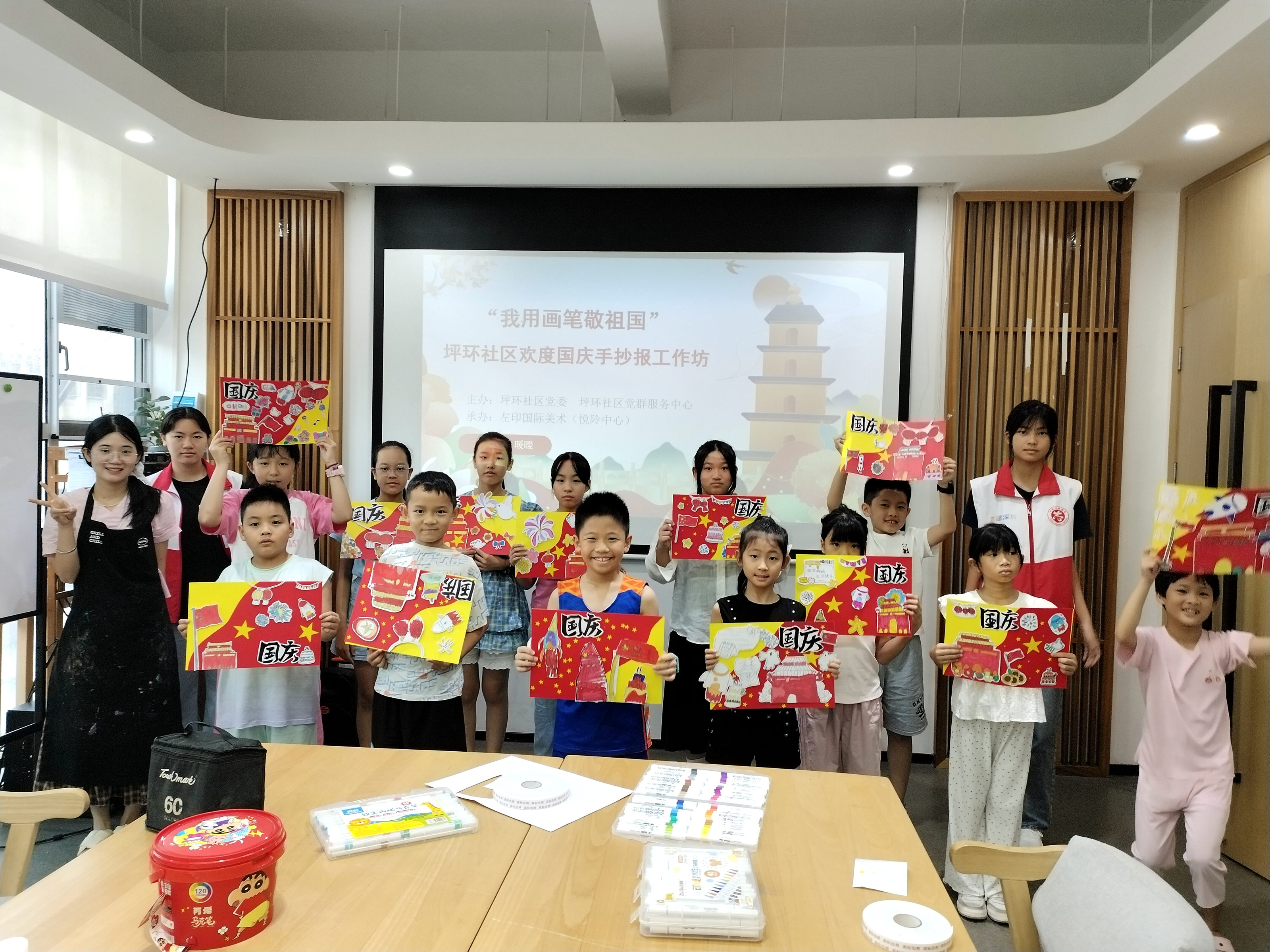 坪环社区党群服务中心联合社区新时代文明实践站与社区妇联,开展“我用画笔敬祖国”手抄报创作与“童心向阳贺祖国”亲子手工坊两场主题活动,通过绘画与手工等寓教于乐的形式,让孩子们在实践体验中表达对祖国的热爱。