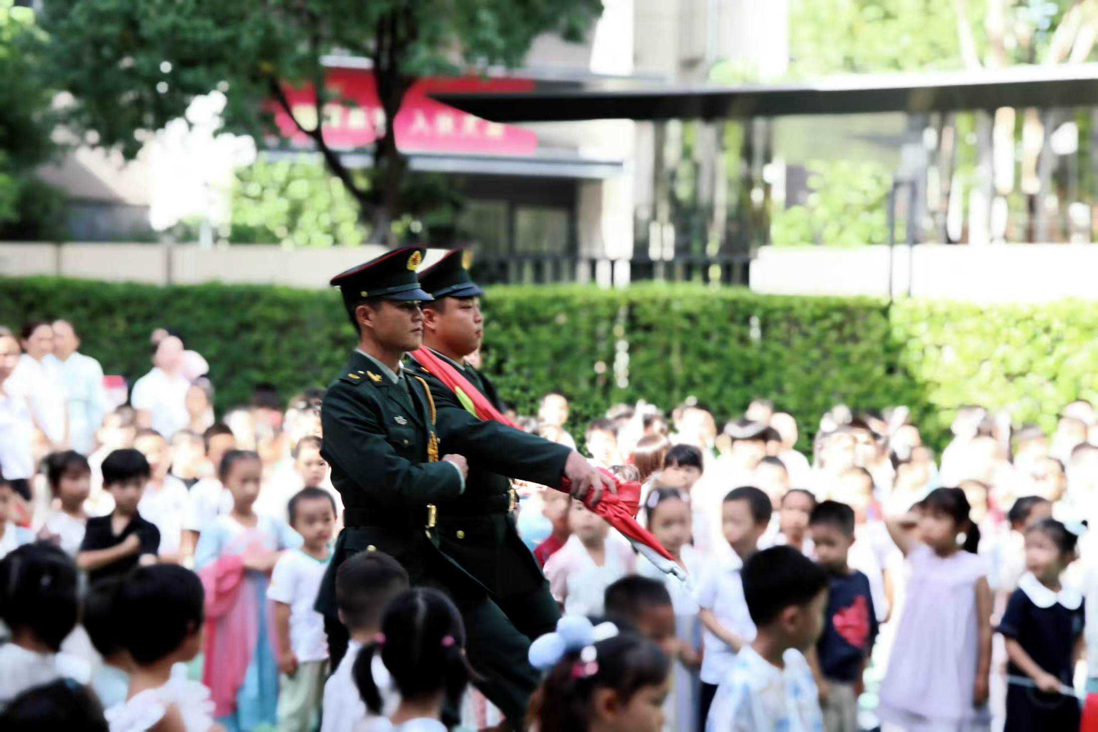 伴随着清脆的入园铃声,2 名退伍士兵身着笔挺的军装,迈着铿锵有力的正步走向旗杆,挺拔的身姿、标准的动作瞬间吸引了孩子们的目光。当雄壮的国歌奏响,鲜艳的五星红旗在士兵的护送下缓缓升起,原本活泼好动的孩子们纷纷挺直小身板,眼神专注地望向国旗,有的还不自觉地举起小手,模仿着敬礼的姿势,现场氛围庄严而热烈。