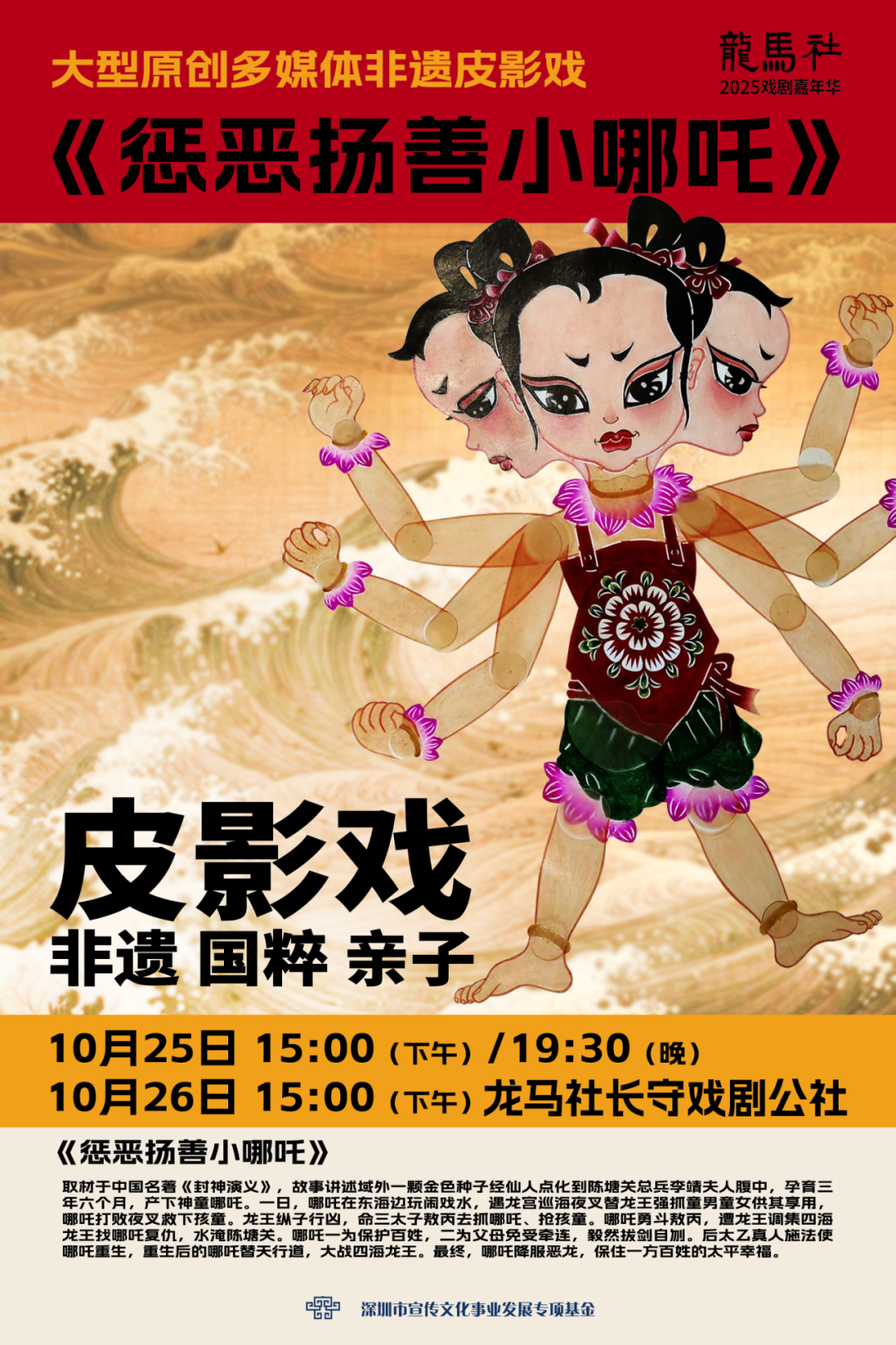 这部60分钟的大型皮影舞台剧,由国家级非遗华县皮影戏陕西省级传承人薛宏权团队历经四年精心打磨。剧目取材于中国家喻户晓的古典神话小说名著《封神演义》,在忠于原著的基础上审慎创新,讲述哪吒从诞生到战胜邪恶的成长历程。