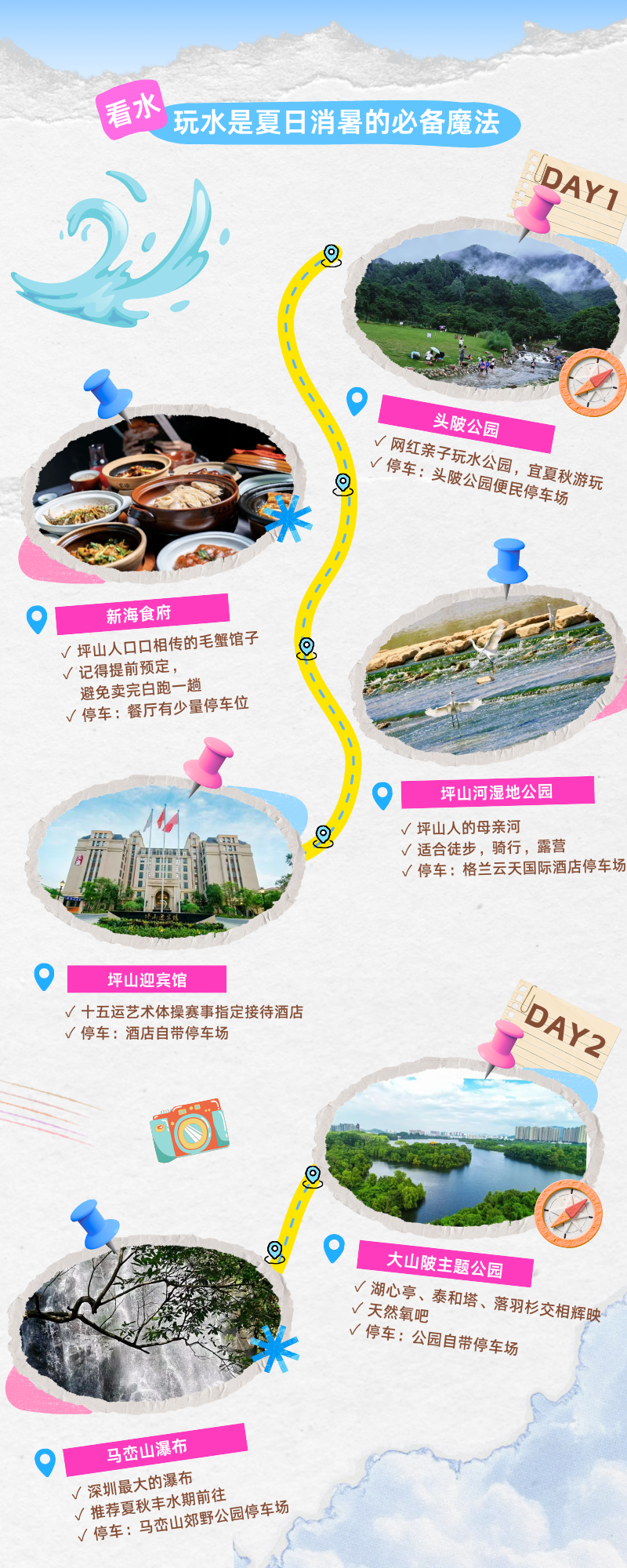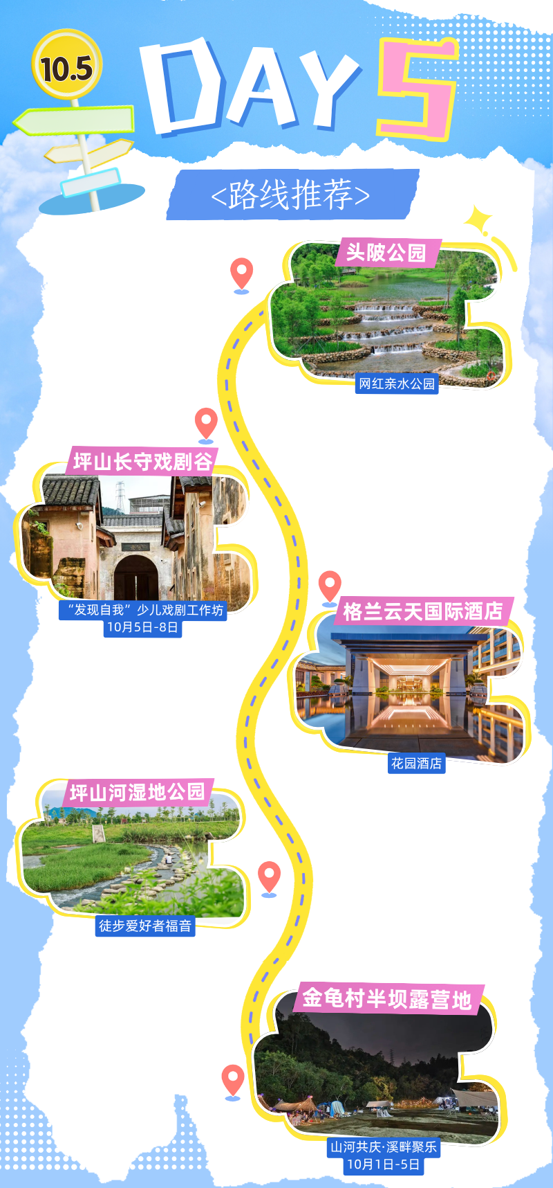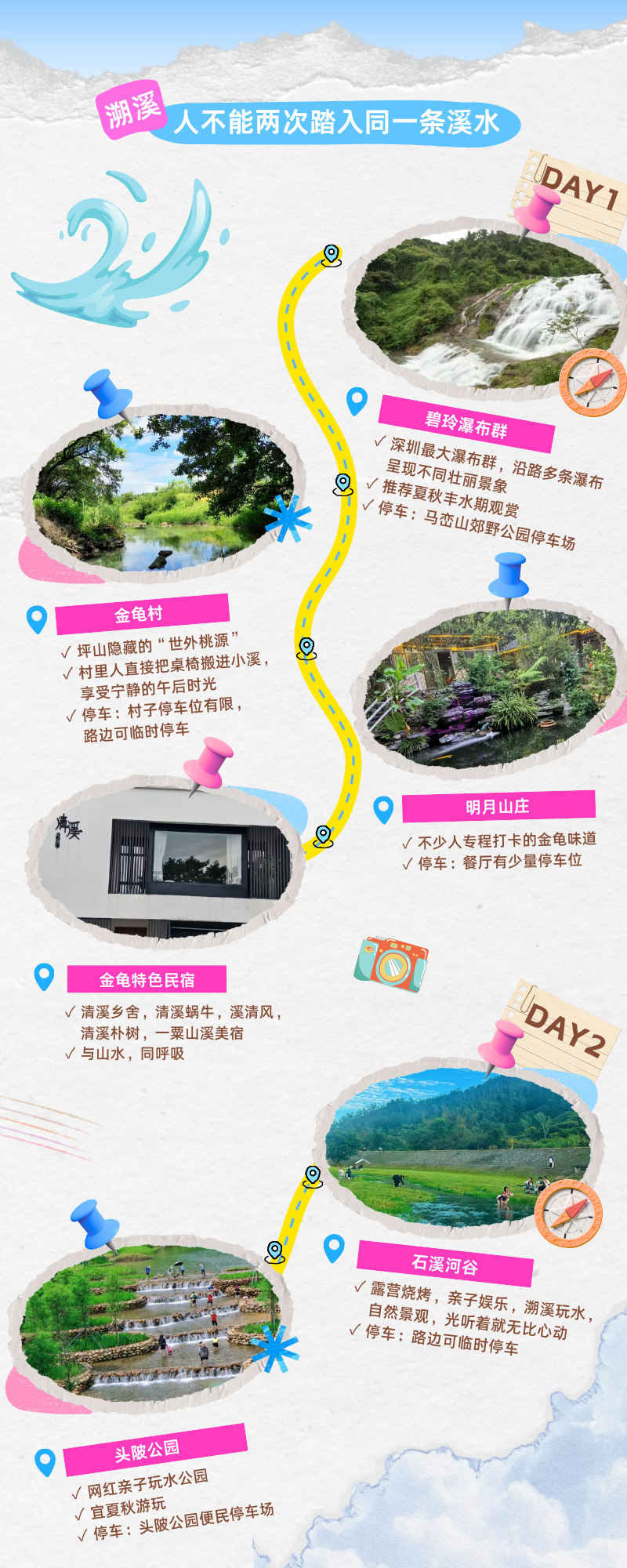 上午头陂公园亲水踩水拍美照,下午长守戏剧谷参加工作坊解压;住格兰云天酒店,傍晚坪山河徒步;入夜去金龟村露营地赶国风生活节,溪畔聊天玩游戏,快乐翻倍!
