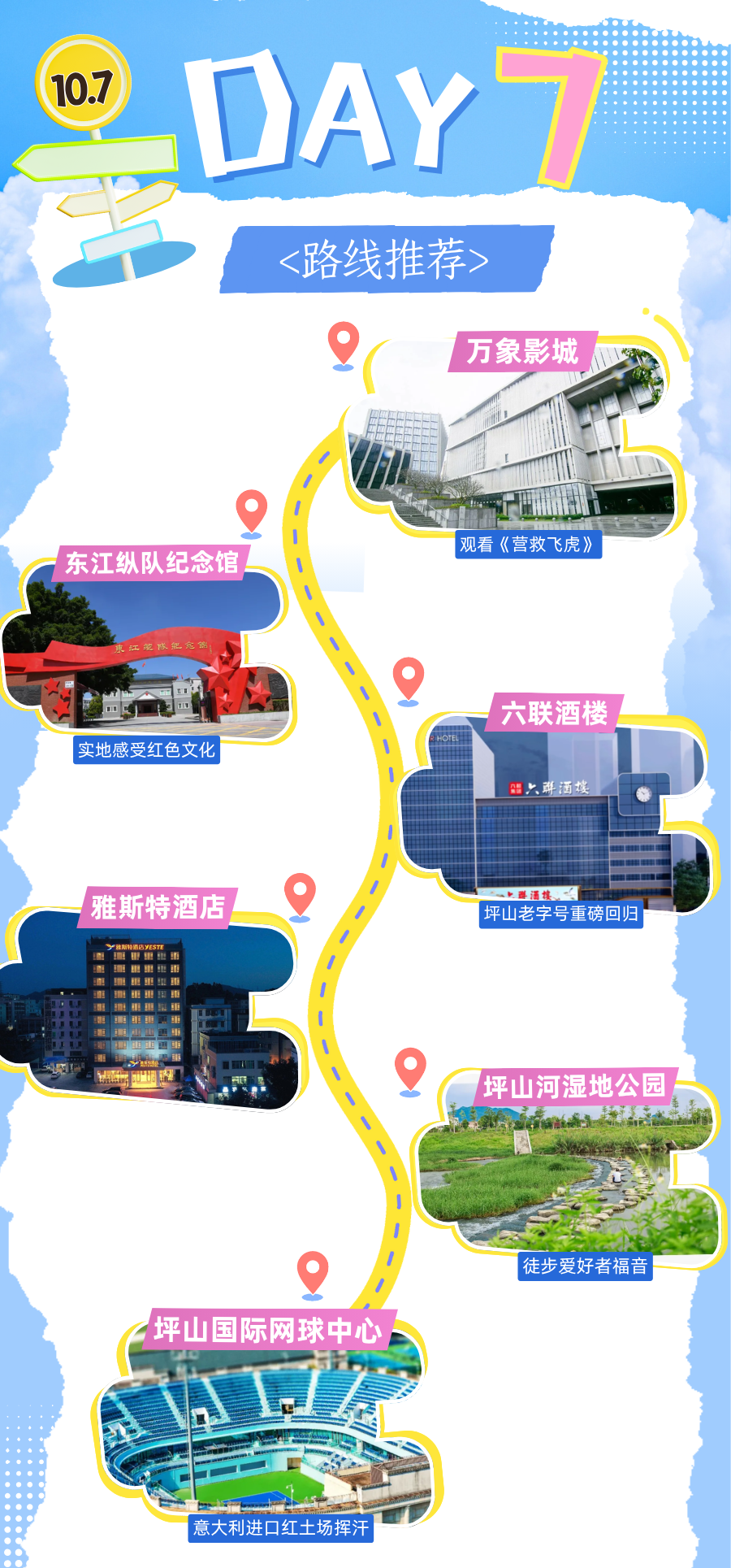 上午万象影城看《营救飞虎》,中午吃六联酒楼老字号;下午逛东江纵队纪念馆忆历史,住雅斯特酒店;傍晚坪山河徒步,最后去国际网球中心红土场挥汗,动静皆宜超尽兴!