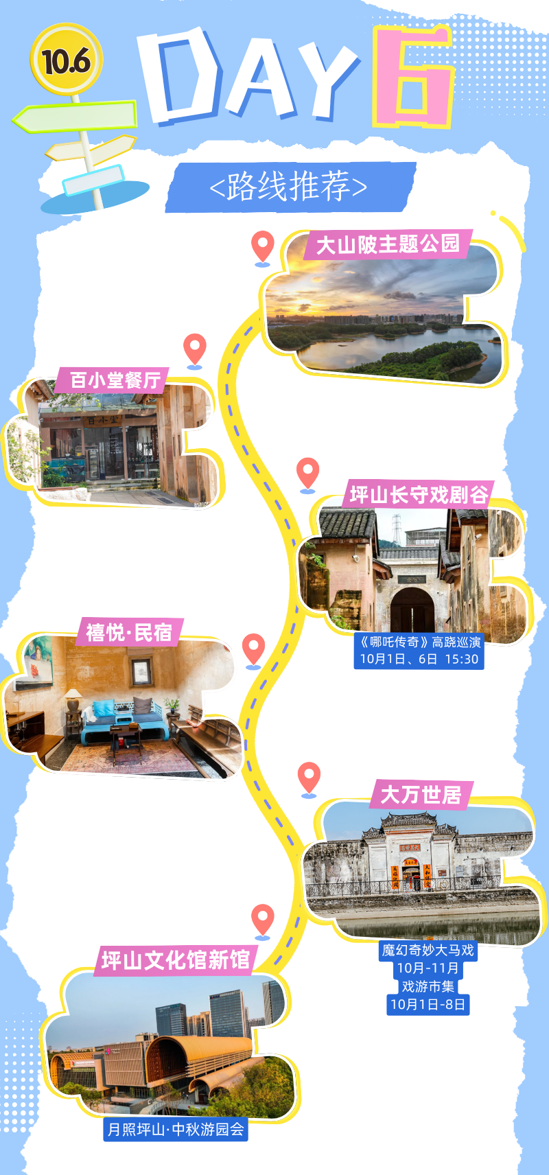 白天逛大山陂主题公园,中午吃百小堂家常菜;下午蹲长守戏剧谷看《哪吒传奇》高跷巡演,住禧悦民宿;接着冲大万世居看马戏、逛市集,晚上去坪山文化馆赶中秋游园会,仪式感拉满!
