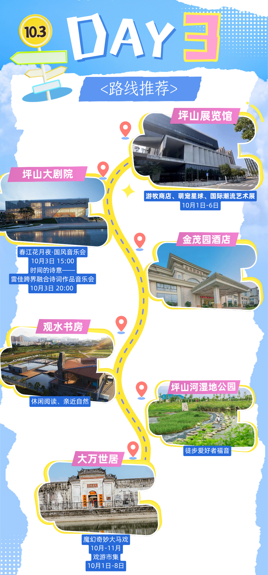 白天逛坪山展览馆看展淘文创,抽空去观水书房看书赏景、坪山河徒步;晚上坪山大剧院听雷佳音乐会,住金茂园酒店;最后冲大万世居,看皇家马戏、逛市集,客家围屋热闹超吸睛!