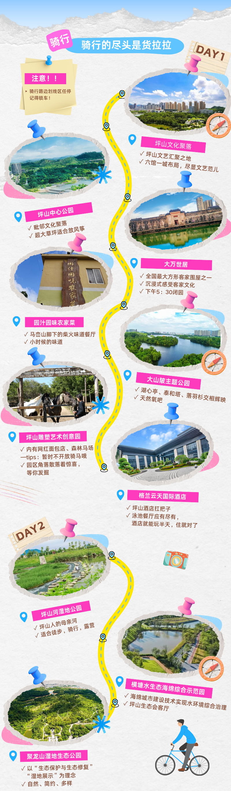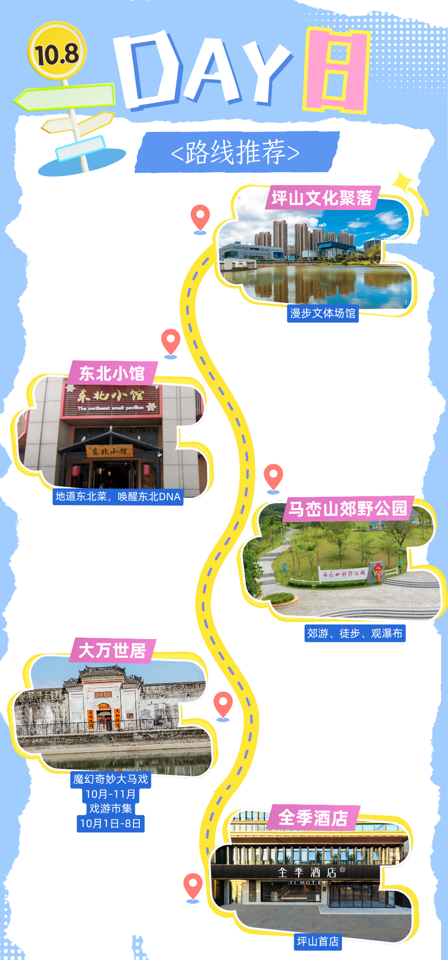 白天泡坪山文化聚落拍展看书,中午吃东北小馆唤醒家乡味;下午马峦山赏瀑布,再冲大万世居补逛马戏市集;住全季酒店休整,打包坪山文艺与烟火,带着美好假期体验朝着生活再出发~