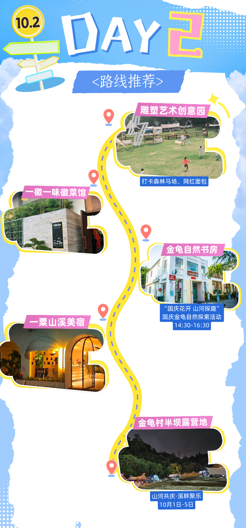 上午逛坪山雕塑园,森林马场拍大片、囤网红面包;中午吃一徽一味徽菜,鲜到舔盘;下午金龟自然书房玩手工,傍晚住一粟山溪美宿;入夜去金龟村露营地赶国风生活节,听溪流、玩游戏,山野浪漫拉满!