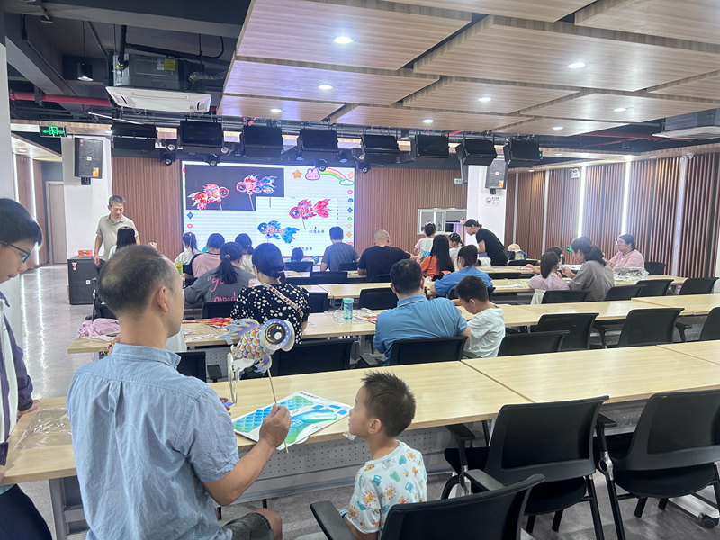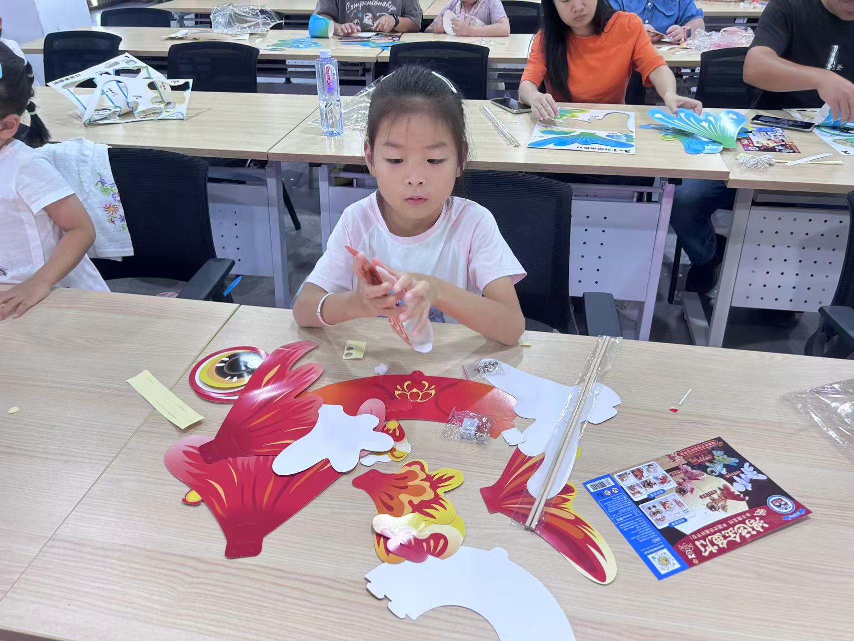 活动现场,家长与孩子们围坐一堂,用彩纸精心剪裁出鱼鳞、鱼尾,再点缀以流苏与灯珠。孩子们时而踮脚粘贴装饰,时而低头调整造型,眼中满是好奇与专注;家长们则手把手传授技巧,分享中秋习俗故事,亲子间的默契在指尖流转,传统文化的温度在协作中传递。