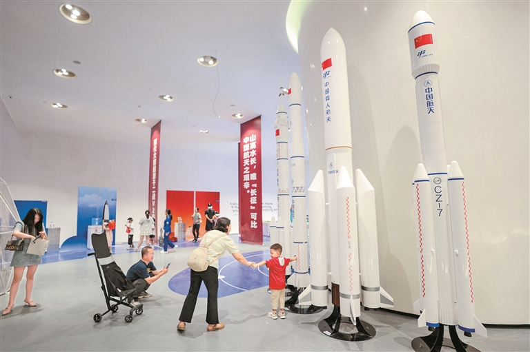 ▲市民游客打卡深圳太空馆各类航天装置。 深圳特区报记者 何龙 摄