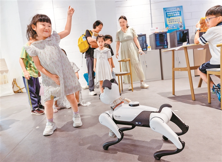 ▲市民游客与湾区之眼智能机器人中心展示的机器狗互动。 深圳特区报记者 周红声 摄