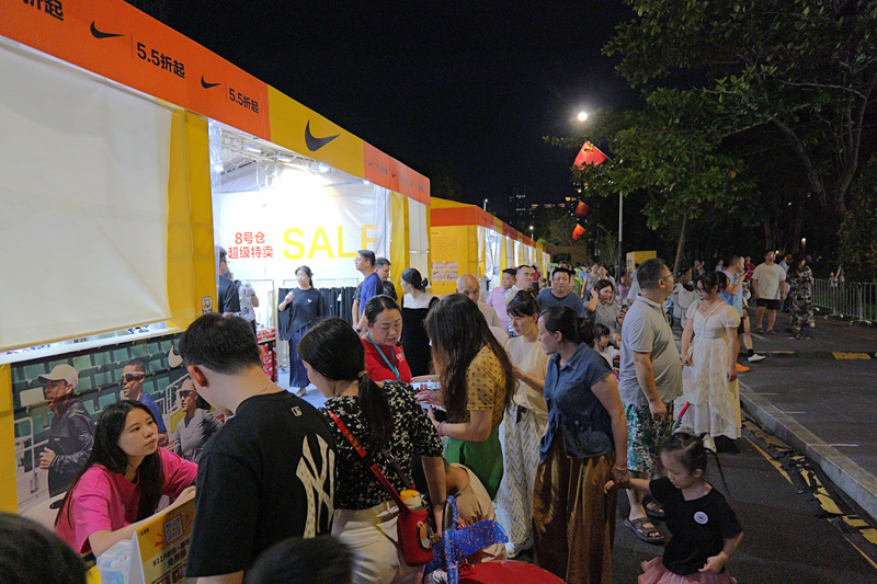 在灯串璀璨的城市生活营地里,小孩追逐着五彩斑斓的气球,那纯真的笑容洋溢着对生活的热爱;青年忙着拍照打卡留下美好瞬间,展现出积极向上、追求美好的精神风貌;老人则驻足赏灯,感受节日的氛围,传承着尊老爱幼的传统美德。在特卖区里,不少市民排队试穿、比价、选购心仪的商品,他们理性消费、互帮互助,体现出文明有序的消费习惯。