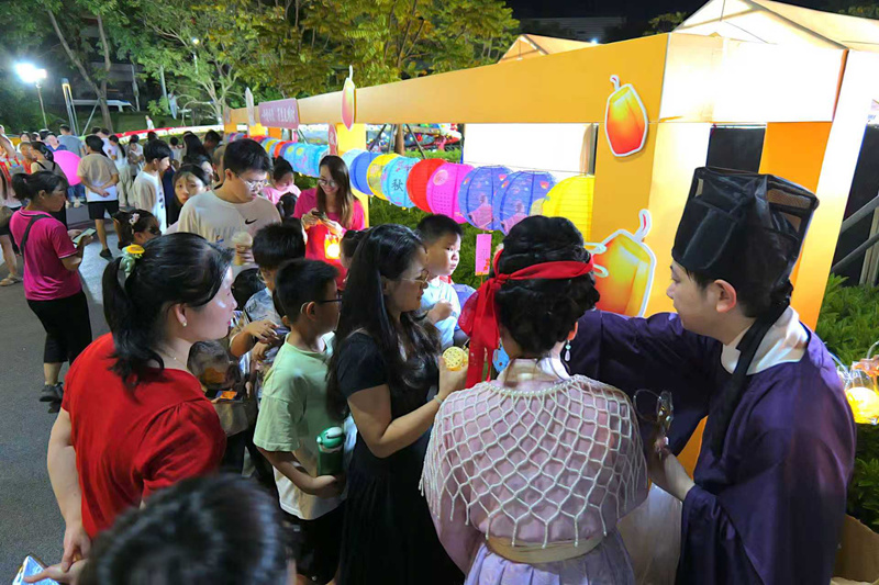与此同时,中秋特别环节——“猜灯谜 领月亮”同样吸引了众多市民的目光。活动现场,身着汉服的NPC小姐姐融入人流,与市民亲密互动猜灯谜。答对者即可领取一盏象征团圆的月亮灯,灯火映照下,人潮如织,欢笑如潮。月下的笑脸与交相辉映的灯光不仅增进了邻里之间的感情,更传承了中华优秀传统文化。这既是节庆的仪式感,也是传承文化、凝聚人心的生动体现。