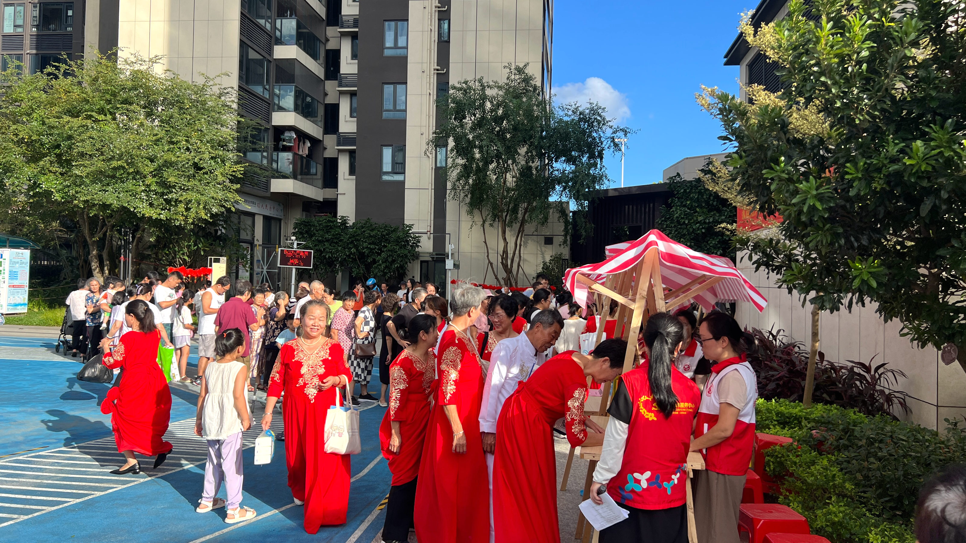 活动分为两个阶段进行,第一阶段开展游园会,居民畅游猜灯谜、党史知识问答、客家文化知识竞赛等各个环节,居民争相解答各类题目,既考验智慧又寓教于乐。现场还设置长者关爱服务区,社工与志愿者为小区老人提供免费健康咨询服务并送上慰问礼物。第二阶段开展露天电影展播和居民跳蚤市集等活动。 居民自带小板凳围坐观影,在星光下重温历史,激发家国情怀。同步进行的居民跳蚤市集成为邻里互动的亮点,超过10个家庭摆摊交换旧物、手工艺品和自制美食,孩子穿梭其中叫卖二手玩具,家长互相交流帮忙,邻里氛围其乐融融。