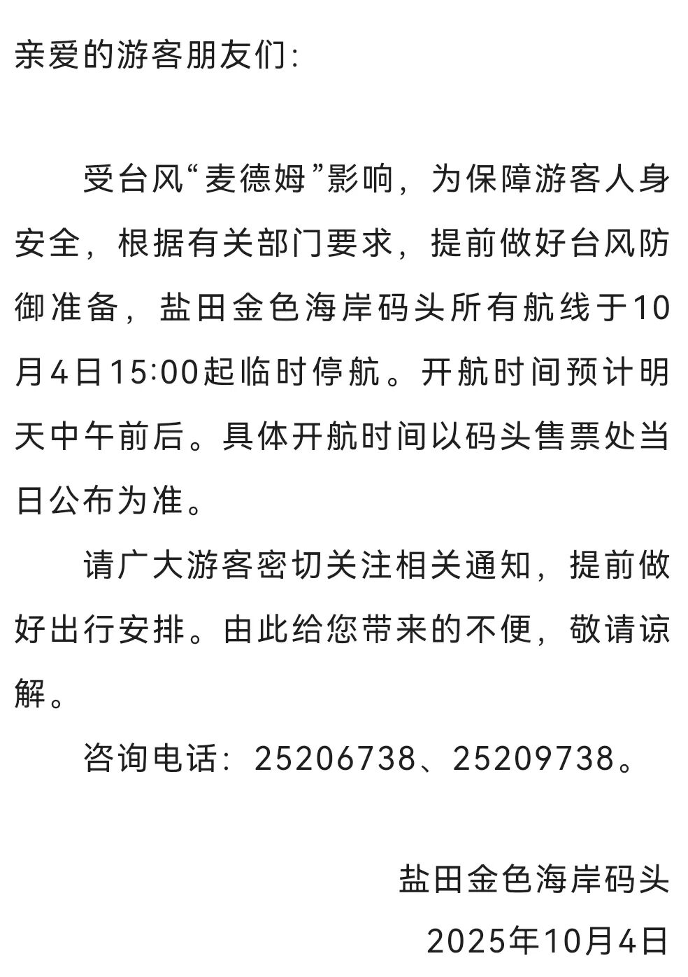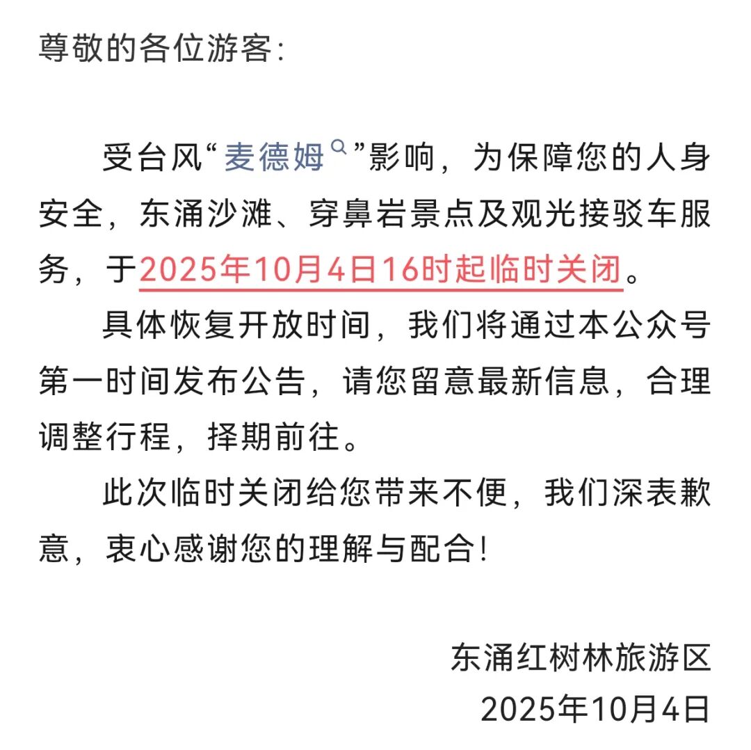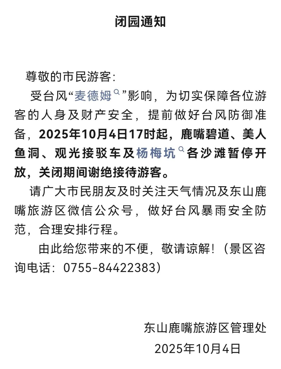 1.10月4日19时至5日18时,滨海旅游景区(沙滩)停业,重新开放时间以官方通知为准。