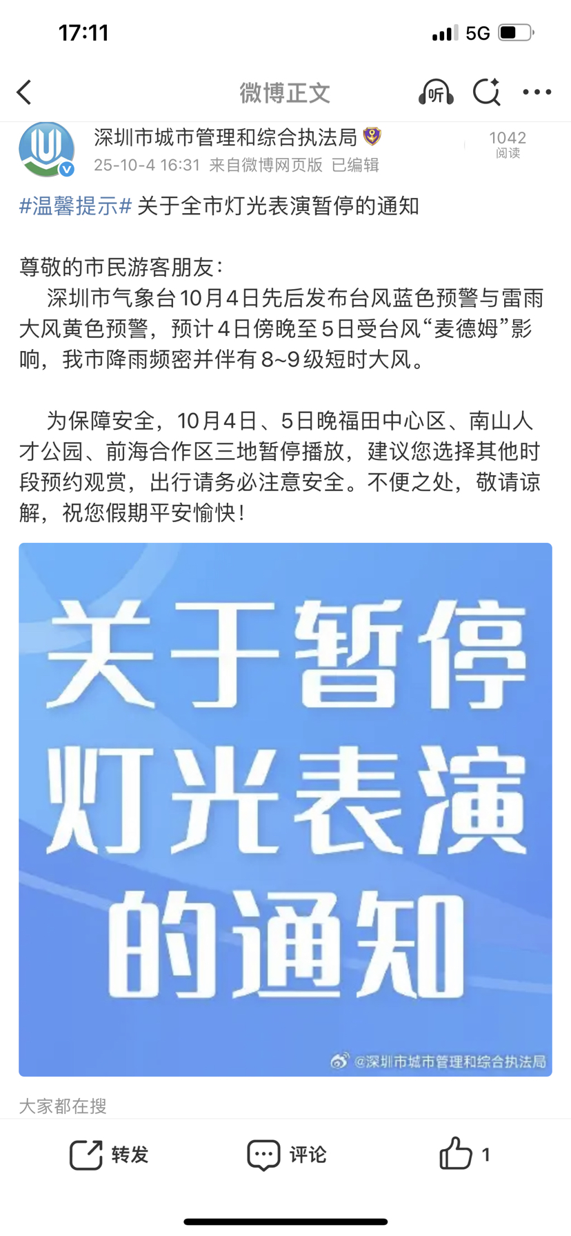 为保障安全,10月4日、5日晚福田中心区、南山人才公园、前海灯光表演暂停播放,建议您选择其他时段预约观赏,出行请务必注意安全。不便之处,敬请谅解,祝您假期平安愉快!