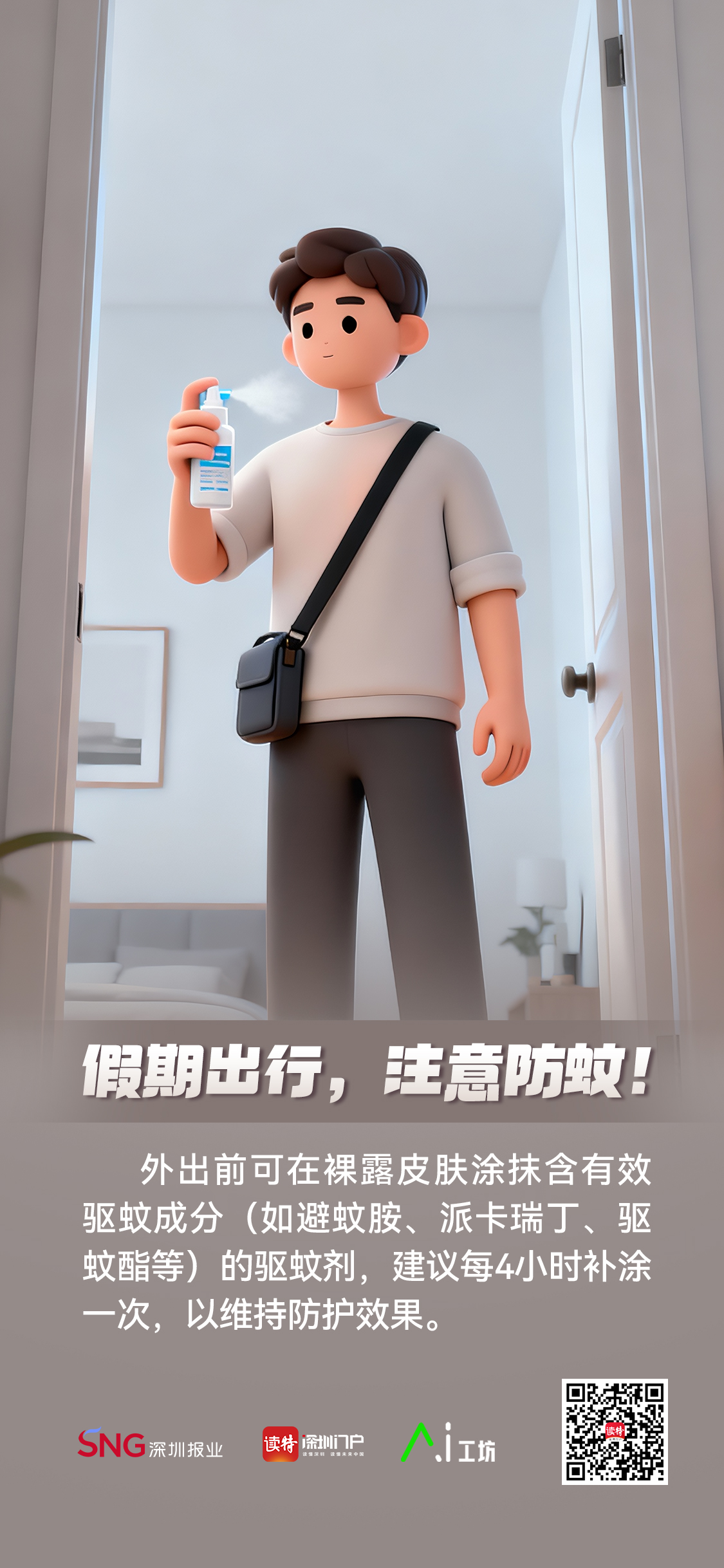 近日,深圳疾控提醒市民朋友,“双节”期间务必注意防蚊,出现发热、关节痛、皮疹等症状,要及时就医。