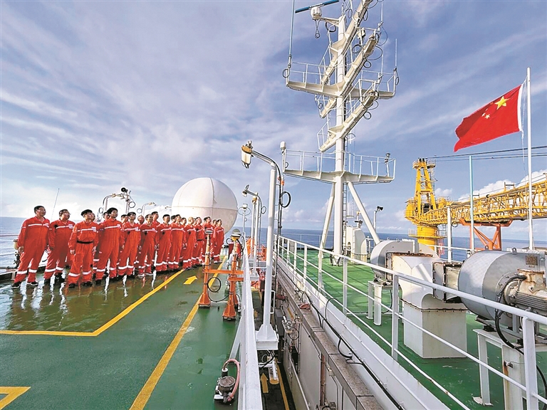 这里没有广场的盛况,但有工装组成的方阵;这里没有庆祝的礼炮,但有熊熊燃烧的火炬。在这举国同庆之时,中国海油工人坚守“深蓝”,以源源不断的清洁能源,守护万家灯火,为粤港澳大湾区经济社会发展注入不竭动力。