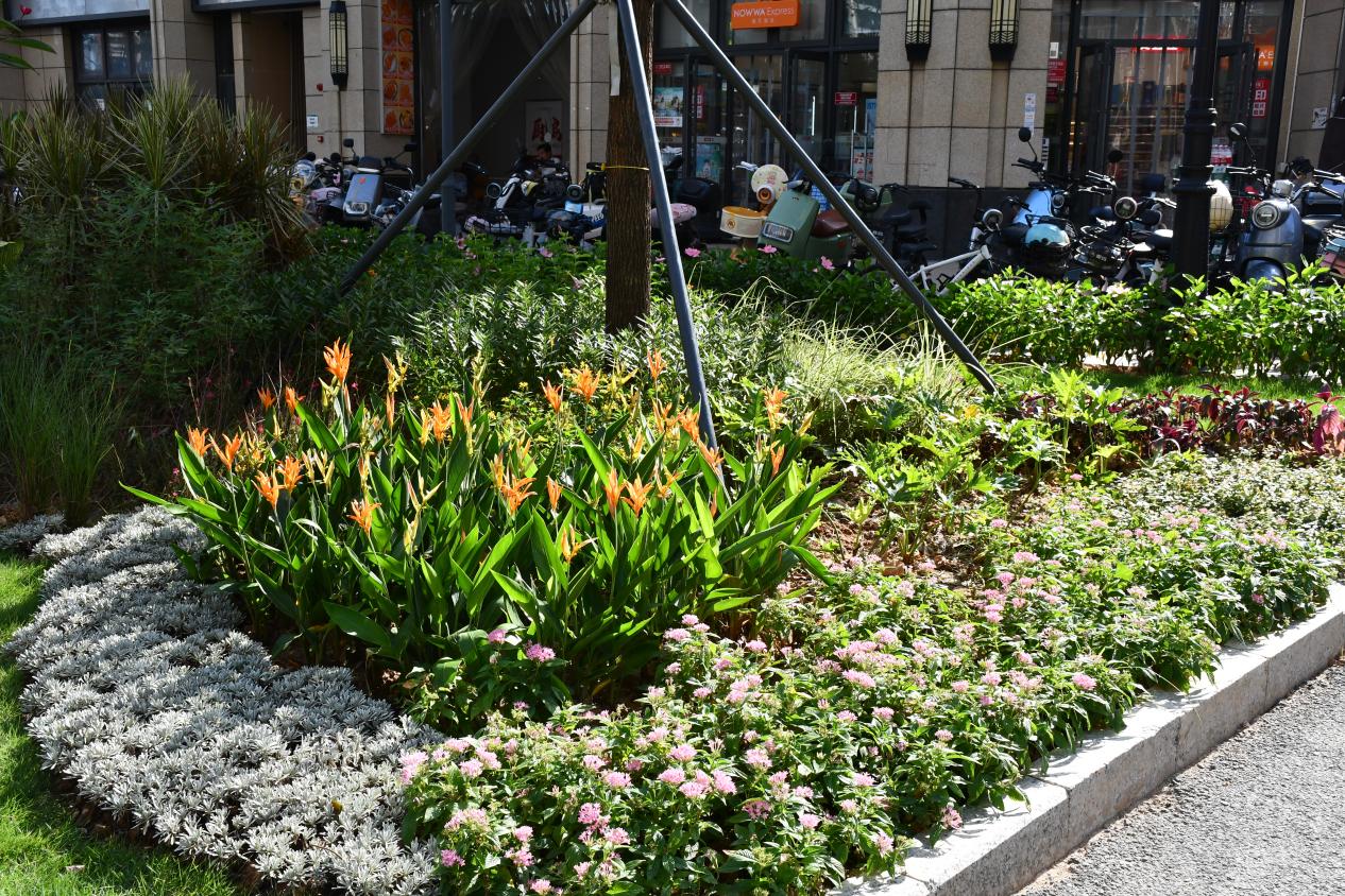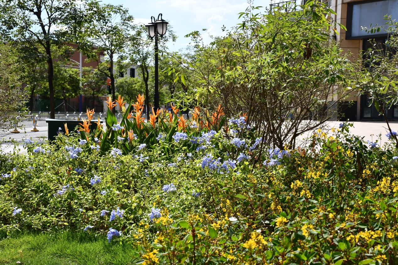 不同于传统公园的块状布局,占地5400平方米联馨绿廊在景观打造上却颇为讲究、别出心裁。项目结合线性带状场地形态,以“居民家门口的生态绿廊”为设计理念,用一条健康绿道把整片绿地串联起来。两侧种植凤凰木、风铃木、紫薇等开花乔木,搭配常青的香樟等遮阴树种。现在香樟已撑起绿荫,等到春天,风铃木会开满淡黄色花朵;夏天凤凰木绽放火红花瓣;秋天紫薇顶着粉紫色花球;冬天依旧能看到满眼绿色,真正实现“四季有景、步步有花”。