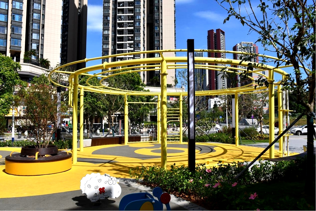 沿着绿道往里走,会发现这座小公园藏着不少“小心思”:近300平方米的户外智能健身区里,漫步机、引体架、腹背训练器等器材一字排开,老人们戴着智能设备就能测运动数据;约260平方米的儿童游乐场用的是环保软塑地面,沙池、秋千、滑梯组成“小天地”,家长坐在旁边的休憩椅上就能照看;126平方米的休闲廊亭更是居民的“歇脚宝地”,累了靠在椅上歇会儿,闻着旁边香樟的清香和邻里聊聊家常,惬意又舒服。