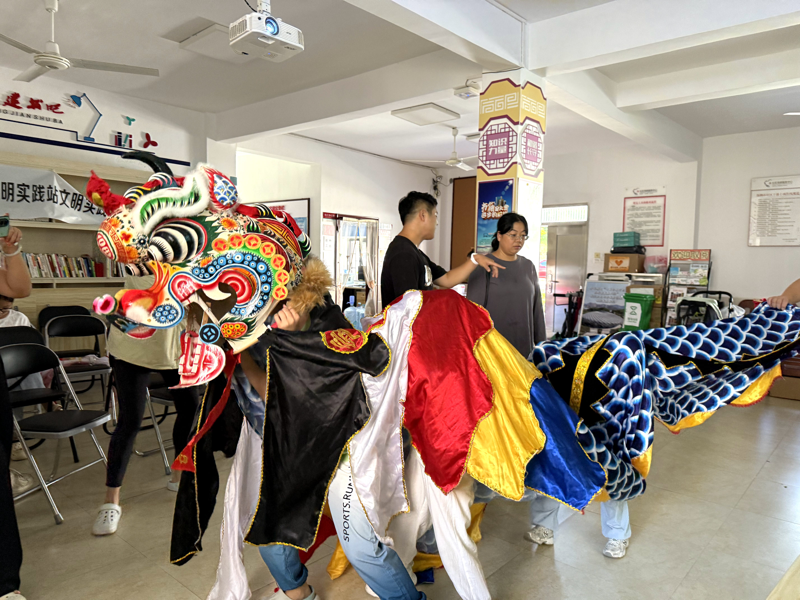 在交流环节,传承人不仅引导大家围绕麒麟舞在当代文化传承中的价值与挑战展开探讨,还特意将麒麟舞道具搬到居民中间,邀请大家近距离触摸、感受。居民好奇地围上前,轻轻抚摸麒麟头的刺绣纹路、触碰灵动的鳞片,不时发出“原来麒麟头这么重”“这刺绣也太精致了”的感叹。在传承人的提议下,大家还自发组队,学习基础的“行礼”“踏步”等动作。