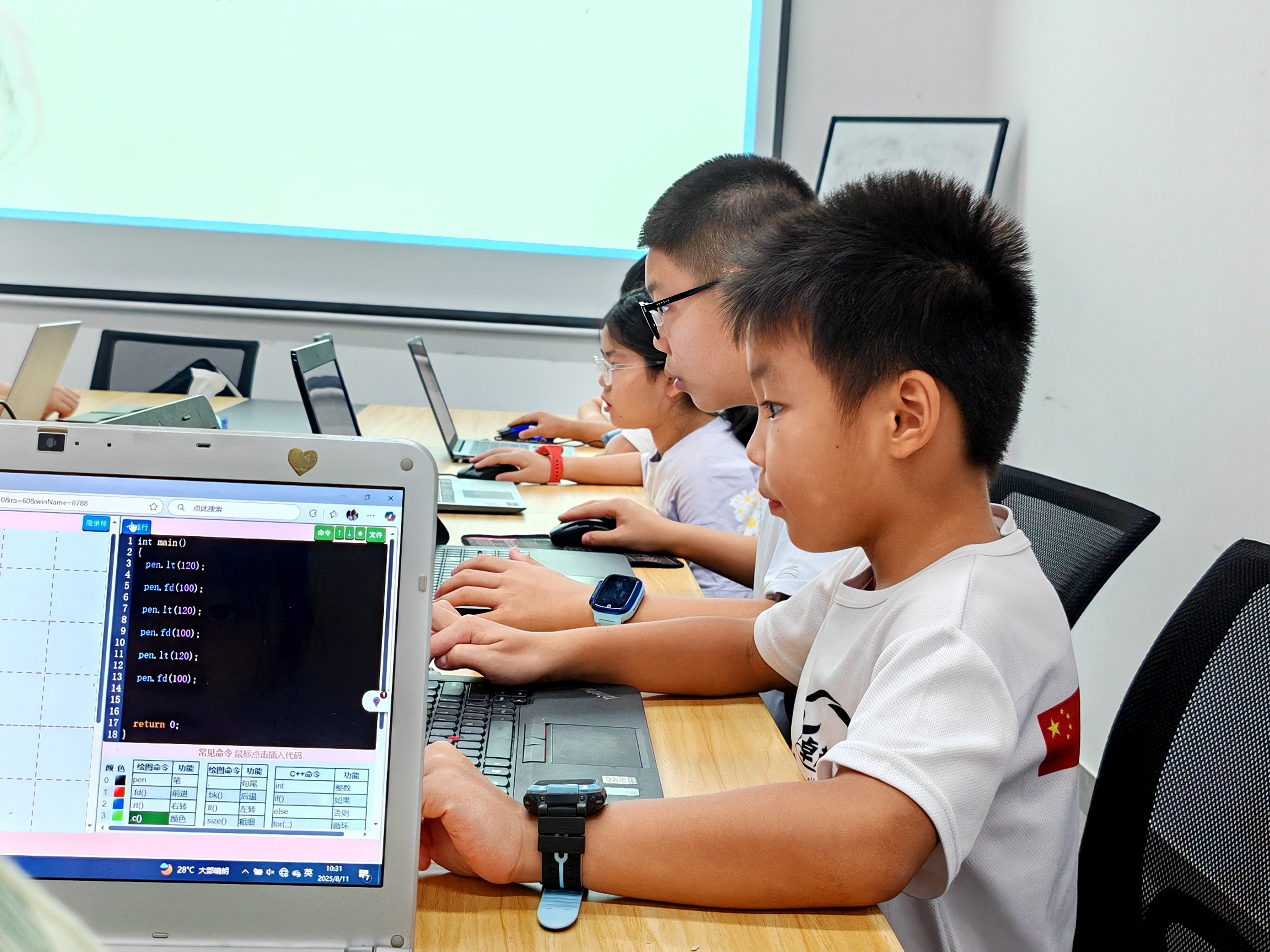 活动现场气氛热烈,孩子在讲师指导下认真编写代码,观察图形变化,积极讨论优化方案,为程序成功运行而欢呼。随着学习深入,孩子逐步从模仿转向自主设计,有的用坐标绘制复杂图案,有的结合文字命令创作个性效果,展现出令人称道的逻辑思维与创造力。