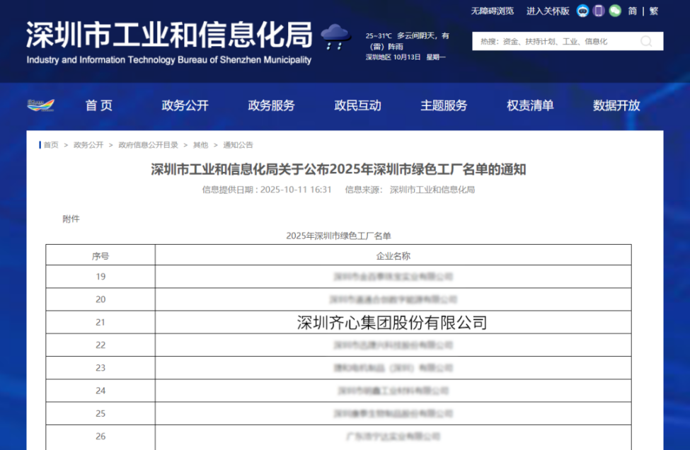 深圳新闻网2025年10月16日讯(记者 陈颖玑)近日,深圳市工业和信息化局公布2025年深圳市绿色工厂名单,全市共有79家企业入选,包括比亚迪、迈瑞生物等来自不同领域的标杆企业,为制造业绿色化转型树立了实践标杆。其中,齐心集团凭借资源节约、环境保护、清洁生产和循环经济等方面的综合表现入选。