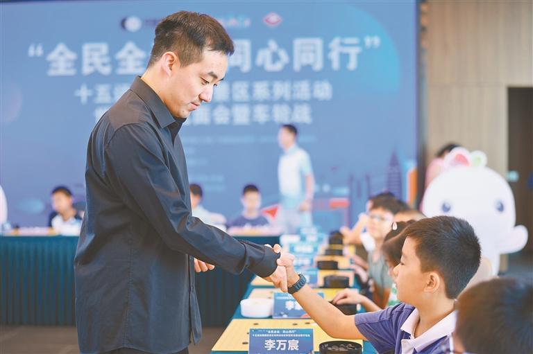 深圳新闻网2025年10月19日讯(深圳特区报记者 赵新明 赖犁 摄)10月18日,“全民全运·同心同行”十五运会围棋进景区系列活动世界冠军见面会暨车轮战在梧桐山风景区梧桐阁举行。现场,围棋世界冠军杨楷文(左一)与20名深圳青少年围棋爱好者同时对弈。