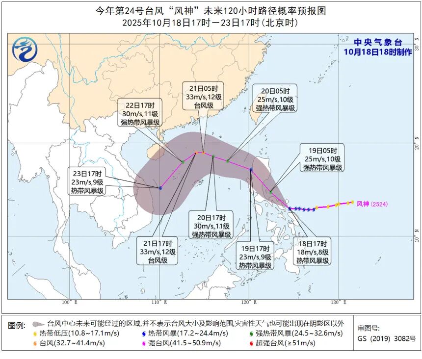 与此同时,于18日凌晨生成的今年第24号台风“风神”(热带风暴级),预计将在19日傍晚前后进入南海东北部,强度逐渐加强,最强可达台风级。