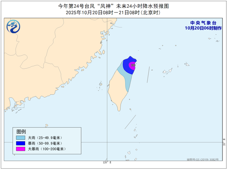降水预报:20日8时至21日8时,台湾岛北部有大到暴雨,局地有大暴雨(100-200毫米)。