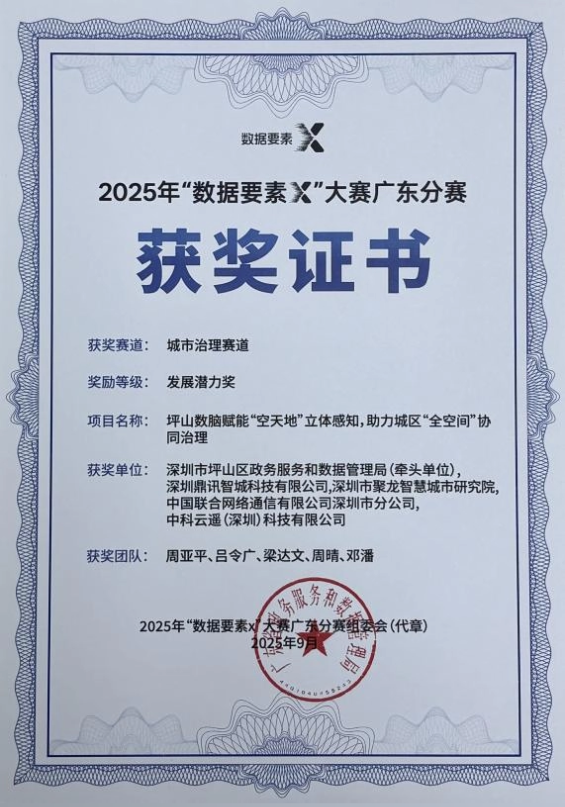 赛事自5月启动以来,吸引了省内外事业单位、企业、科研机构等超过1300个优秀项目同台竞技。由坪山区政务服务和数据管理局牵头申报的“坪山数脑赋能‘空天地’立体感知,助力城区‘全空间’协同治理”项目、由坪山区水务局牵头申报的“数据赋能重塑高效强韧的城市排水系统”项目,历经初赛线上评审、资质审查、技术验证等多层筛选,成功晋级广东分赛决赛“城市治理”赛道及“绿色低碳”赛道。经过决赛路演激烈角逐,2个项目均荣获2025年“数据要素×”大赛广东分赛发展潜力奖。