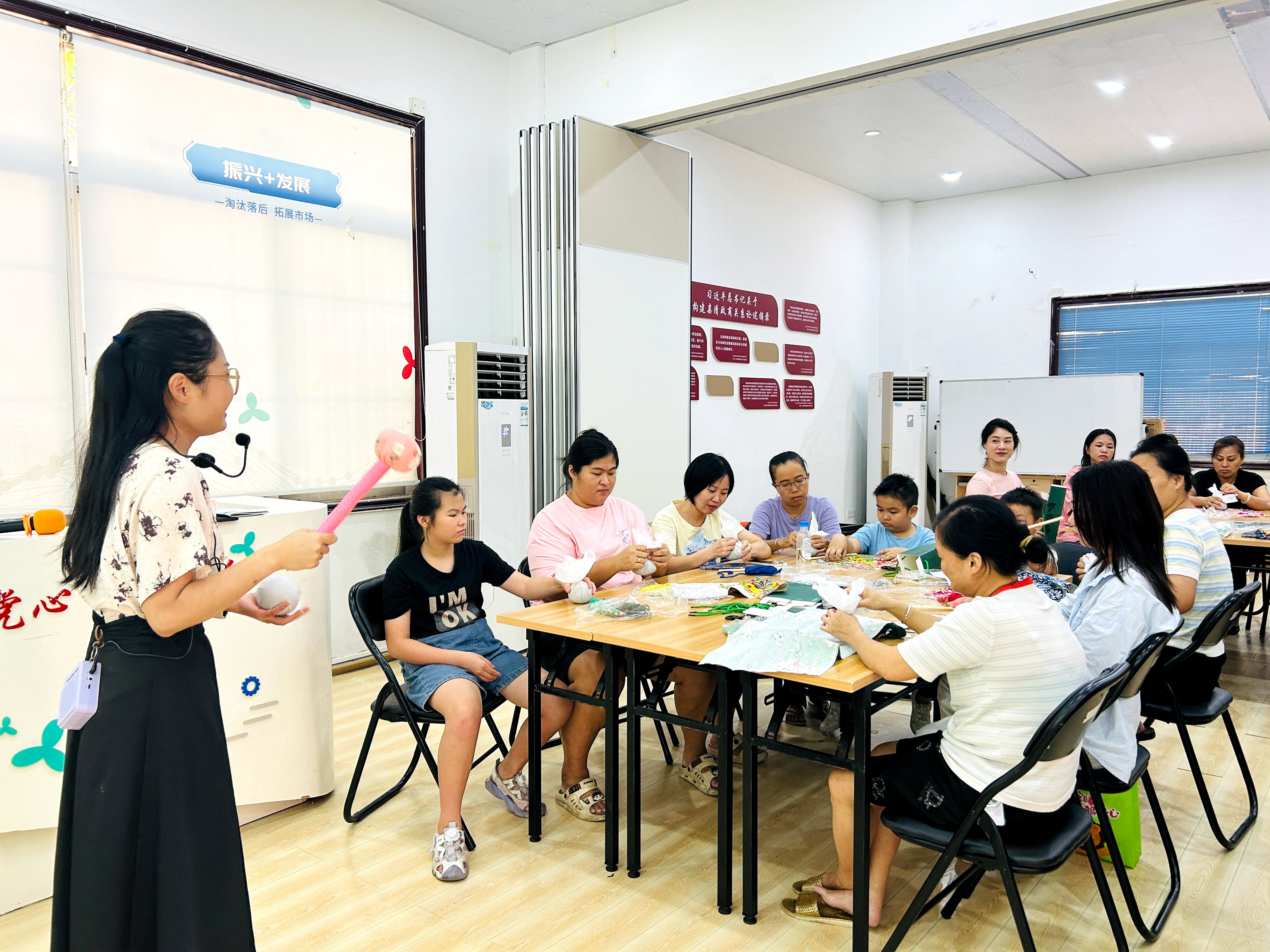 活动邀请了专业健康师围绕中医基础健康知识展开讲解,从日常作息调理、饮食养生原则到常见的亚健康问题应对,健康师用通俗易懂的语言拆解中医养生逻辑,帮助职工建立科学的健康认知。实操环节收获了职工热烈欢迎,艾草锤制作课上,社工带领在大家亲手搭配艾草、棉絮等材料,学习传统艾草锤的制作工艺,既掌握了实用养生工具的制作方法,又感受了中医文化的魅力。随后的健身操实操练习中,社工根据职工日常时间紧、无特定场地锻炼的特点,推荐简单易学的“拍八虚”养生操,带领职工现场练习,纠正发力姿势,帮助职工在碎片化的休闲时间中也能缓解身体疲劳,养成日常锻炼习惯。