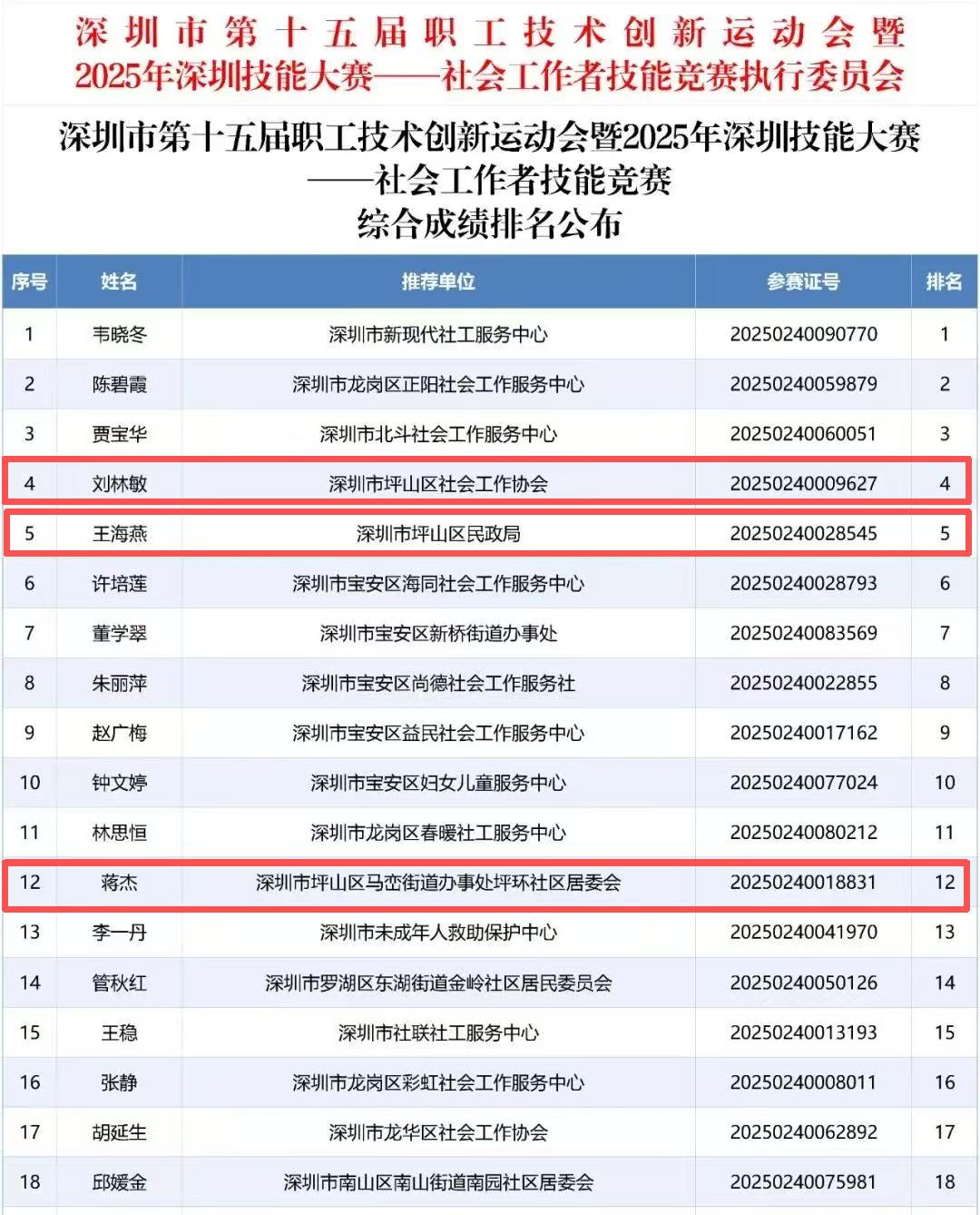 深圳新闻网2025年10月22日讯(记者 邱嘉熙)近日,深圳市第十五届职工技术创新运动会暨2025年深圳技能大赛——社会工作者技能竞赛获奖名单正式公布,坪山区16名社工斩获佳绩,前三等奖获奖3人,其中2人入围“深圳工匠”培育计划。与去年相比,坪山社工在本届比赛中获奖最佳名次、获奖总人数实现“双突破”,为历年最佳成绩,充分展现了坪山社工扎实的专业功底和良好的精神风貌。