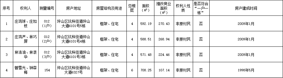 根据《深圳市坪山区坪山大道综合改造工程(北段)》项目的相关规定,我办事处已对本项目范围内房地产进行了相关确权工作,现将确权结果予于公示: