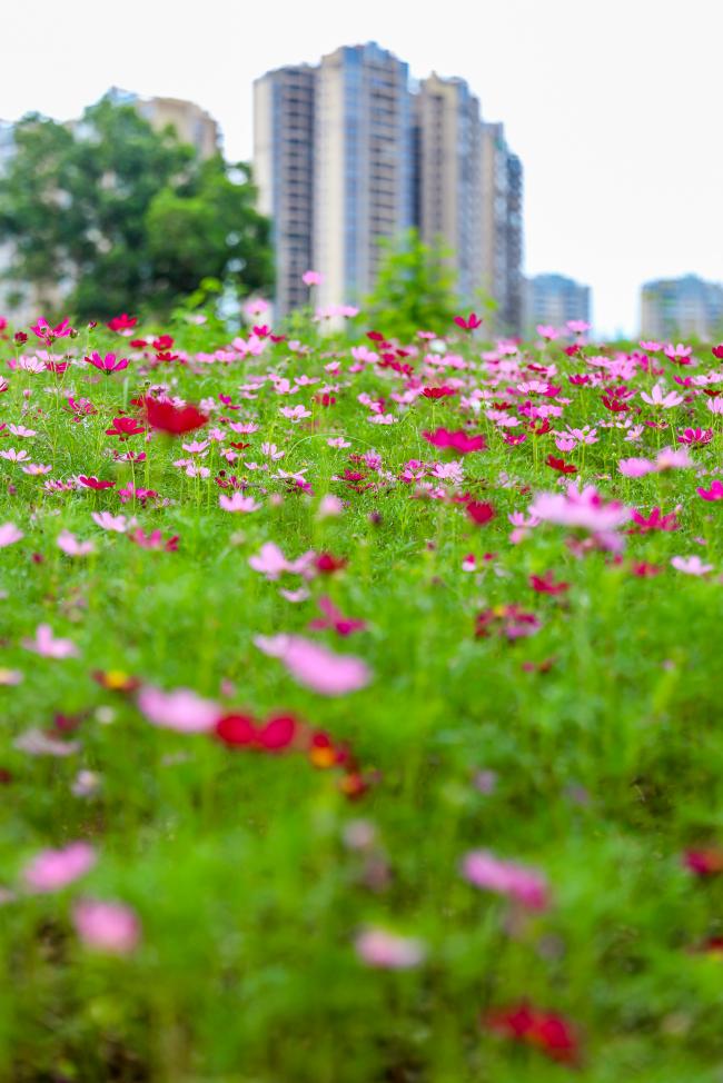 一场以“大清扫、大施肥”为核心的绿地管养行动全面铺开,为城市“绿肺”进行深度保洁和营养补给,确保绿植健康生长。在坪盐通道、坑梓高速出入口、马峦北路等重要交通节点,坪山区城管和综合执法局大胆创新,采用低成本的自然主义种植方式,大面积撒播硫华菊、格桑花等适应性强、观赏性高的原生花籽,总面积约达3万平方米。这些生命力旺盛的花卉,无需过多人工干预,便能肆意绽放,形成一片片绚烂的花海,将原本单调的道路节点,变成了“十五运”期间一道道流动的、充满野趣的“最美浪漫花路”。