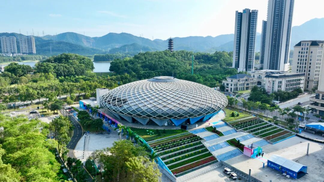 作为十五运艺术体操赛馆,深圳坪山体育中心“飞碟馆”早已换上全运新装,深蓝穹顶如露珠嵌于基座,钢骨架交织,在阳光下折射未来感。