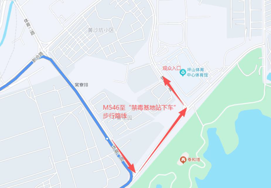 场馆周边设有黄沙坑、大万世居、坪山区禁毒教育基地、曾屋村等公交车站,可乘坐M143、M564、M546、M220、M294、M480等公交线路前往,下车后步行抵达比赛场馆。