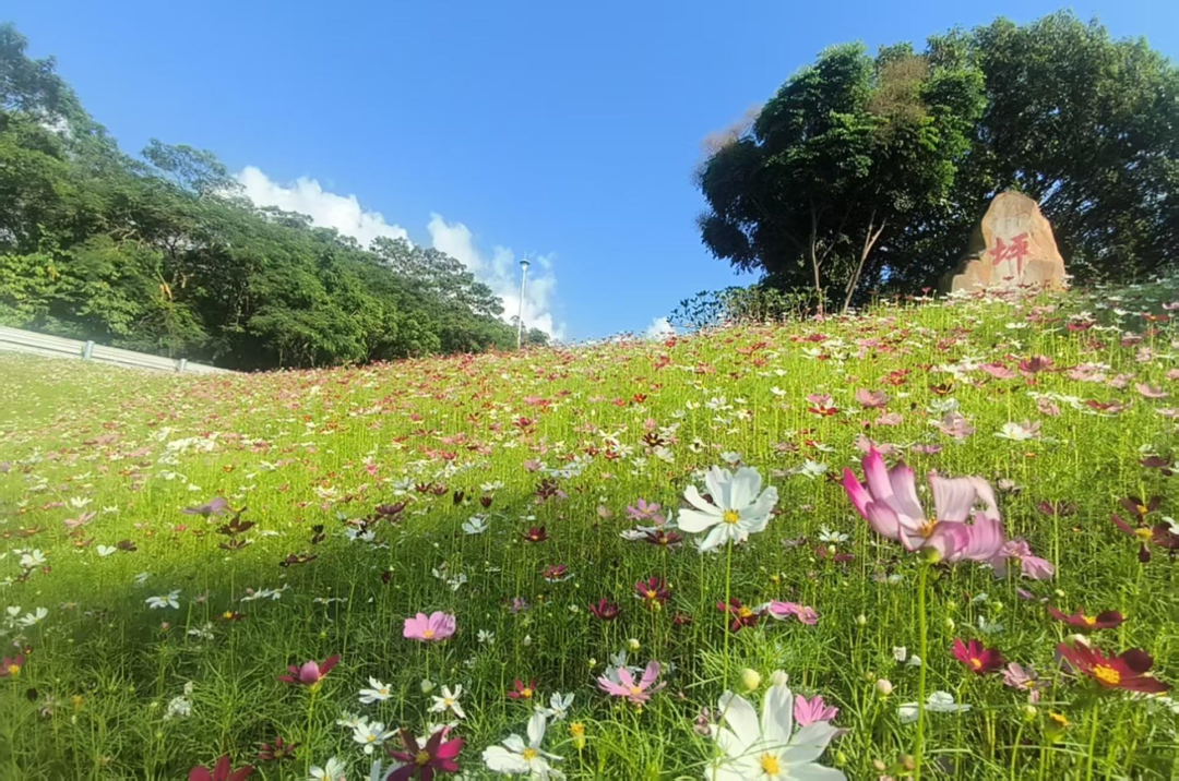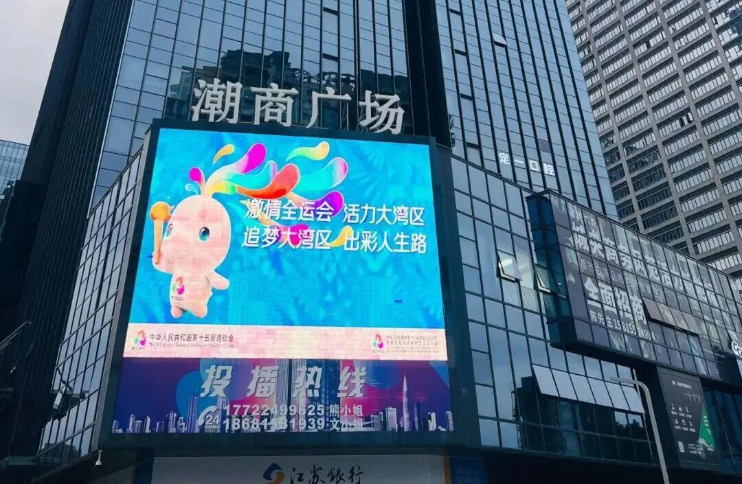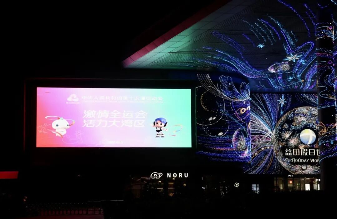商圈地标电子屏流光溢彩,全运会标语跃动,引人驻足。深圳坪山还打造4条花景道路环绕体育中心,云巴沿线花景增色,展现热情迎客姿态。
