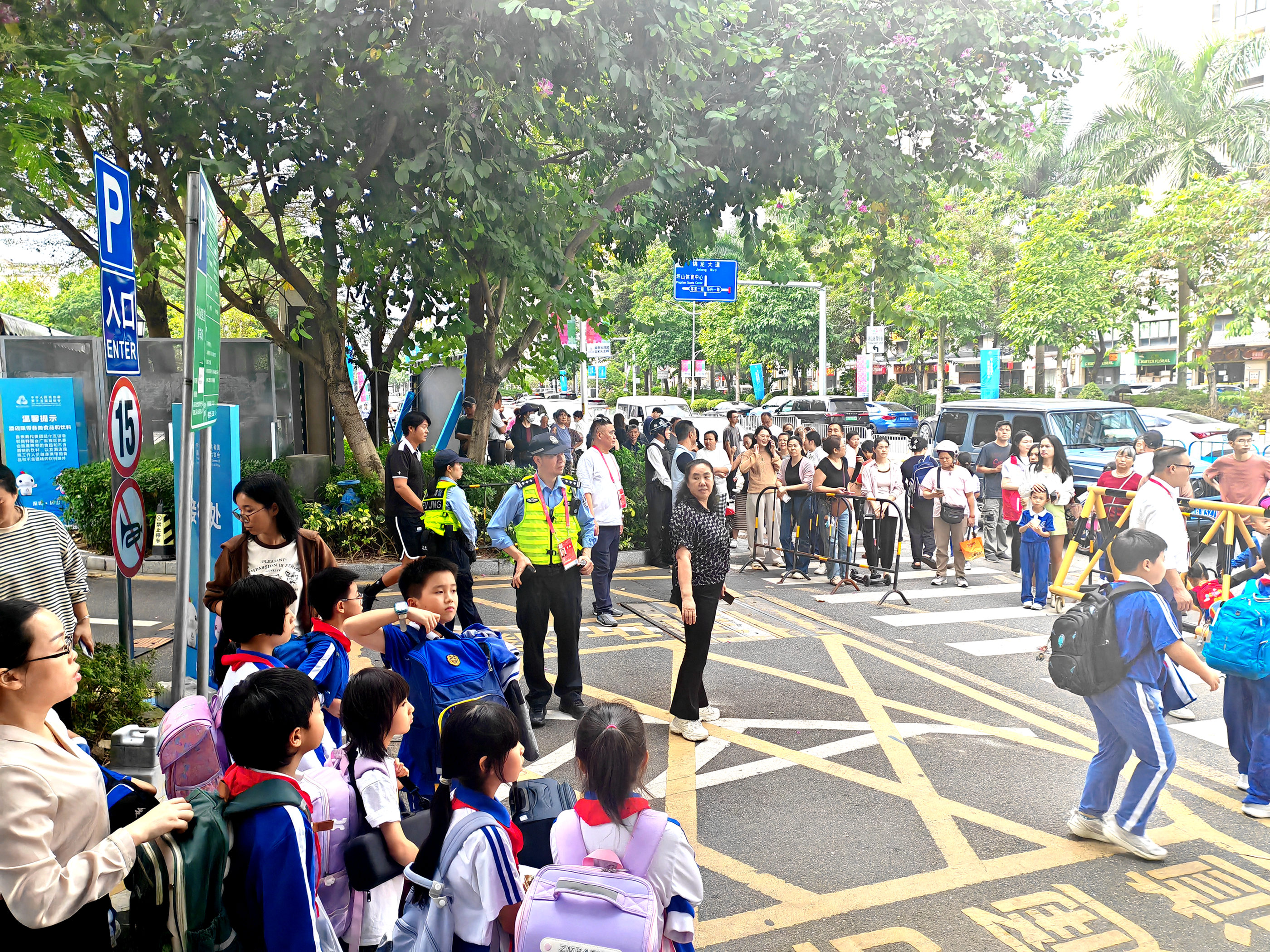 赛事运行务求井然有序且高效流畅。辖区居民的本来生活秩序同样需要正常保障。在酒店实施安保围合管理的同时,如何保障周边的弘金地国际学校900余名师生顺畅通行和80名教职工的停车需求,成为一道现实课题。马峦街道酒店专班坚持“安全为要、便民为本”的原则,由专班安全保障组马峦派出所牵头,联合街道、学校、酒店多方会商,创新推出“分时段、分批、班主任带队”的学生接送方案,开辟外围专用通道,并实行校内停车场错峰共享。一系列举措既保障了赛事核心区的安全,又最大限度减少了对周边居民日常生活的干扰,实现了赛事保障与民生需求的和谐共融。