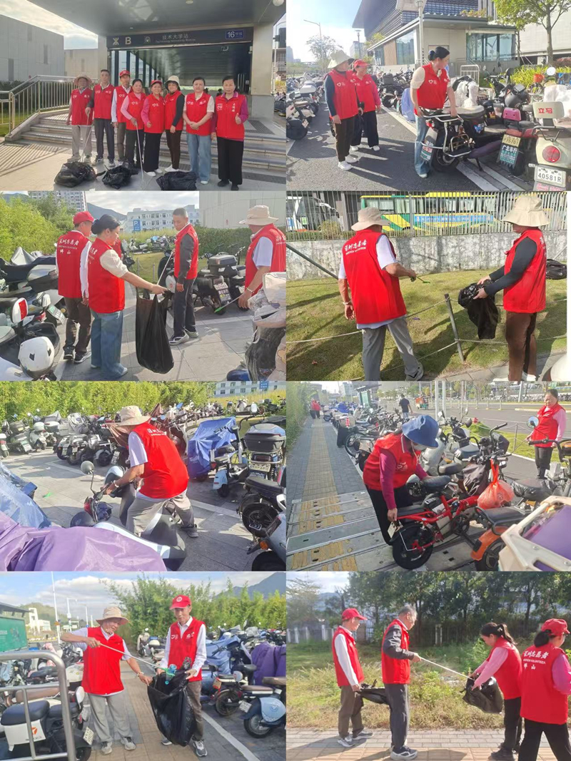 活动当天,身着统一标识服装的志愿者们手持扫帚、垃圾夹、宣传册等工具,分组奔赴深圳技术大学周边重点区域,化身城市文明“守护者”,同步推进环境卫生整治、文明行为劝导、规范停车秩序等多项服务,形成一道流动的“文明风景线”。在路面及绿化带区域,志愿者们弯腰拾捡白色垃圾、清理堆积杂物,细致清扫卫生死角,让街道环境焕发出洁净光彩;在地铁站口非机动车停放区,大家耐心规整乱停乱放的车辆,引导市民规范停放,营造安全有序的出行环境;走进周边小区和居民楼,志愿者们向居民发放文明城市创建宣传册,用通俗易懂的语言普及垃圾分类标准、邻里互助礼仪等知识,积极倡导文明健康的生活方式,得到居民们的纷纷点赞。