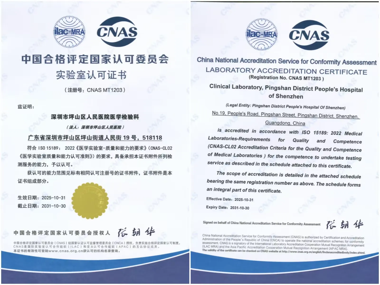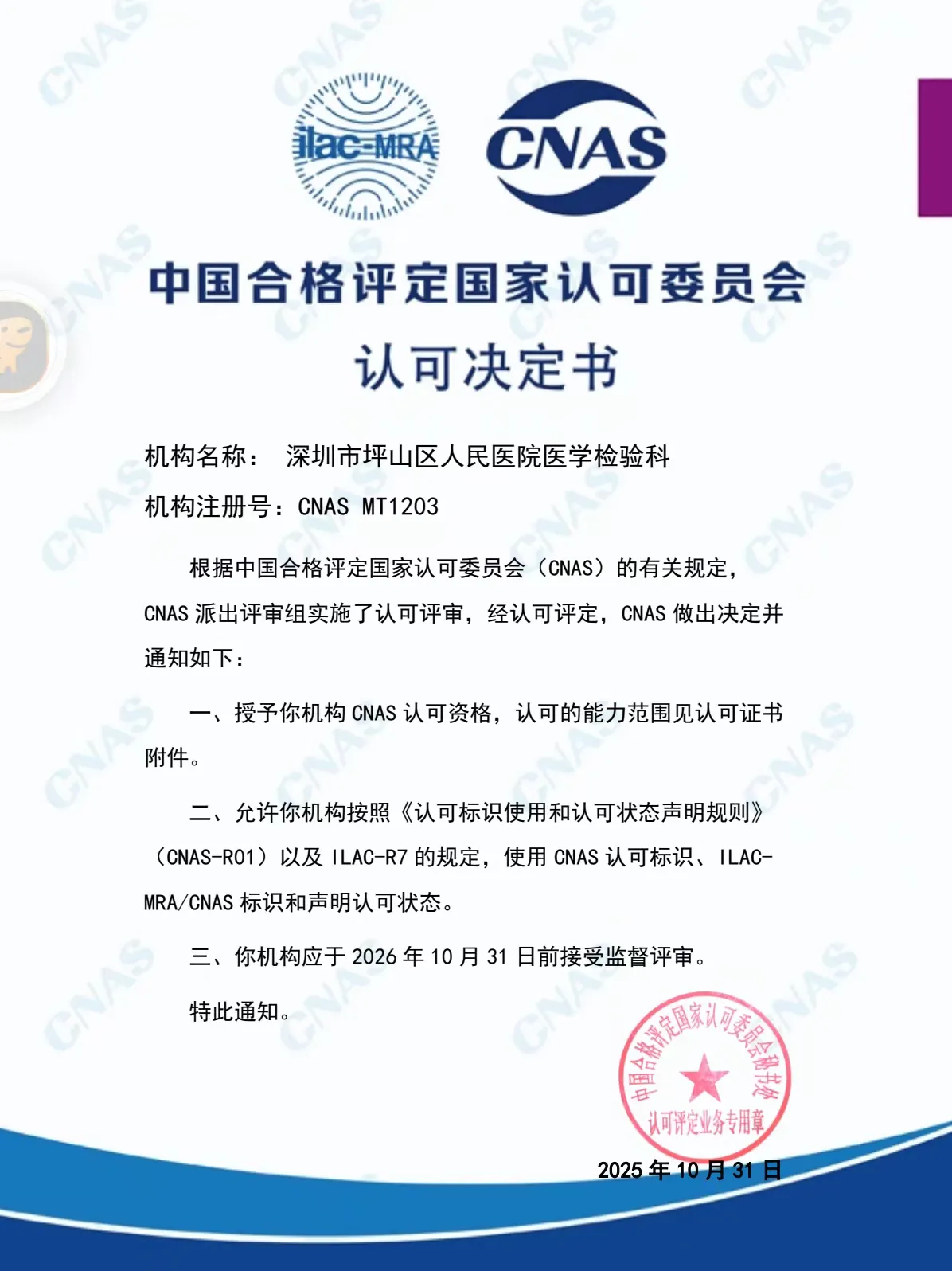 深圳新闻网2025年11月12日讯(记者 程熙)日前,深圳市坪山区人民医院收到中国合格评定国家认可委员会(CNAS)正式通知,该院医学检验科通过CNAS ISO 15189医学实验室认可,获颁国家级认可证书(编号:MT1203)。此次认可标志着医院检验实验室质量管理体系和技术能力全面接轨国际标准,获得认可的检验项目(132项)可在全球多个国家和地区数千家实验室实现结果互认。