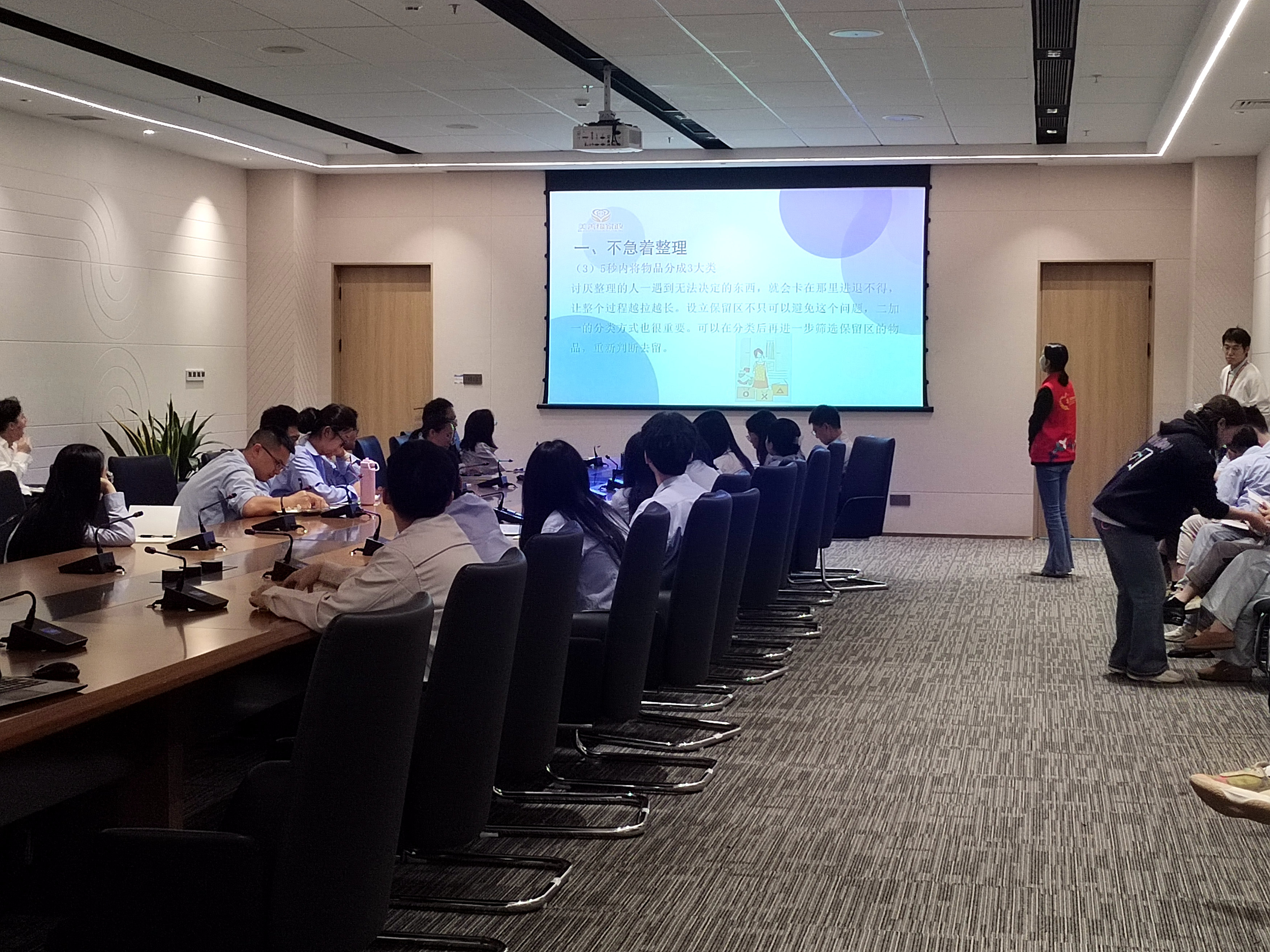 课程内容设计兼具针对性与实用性,专业讲师围绕“家居整理收纳”“出差行李箱整理”及“工位办公桌整理”三大核心场景,进行了系统性的讲解。课程不仅传授了“断舍离”的理念、空间规划的原则等理论知识,更注重实操与互动。在社工的引导协助下,职工踊跃参与到实操演练环节中,动手练习衣物折叠、行李箱空间最大化利用、办公桌面布线整理等技巧。现场气氛活跃,大家在动手实践中深刻感受到了整理收纳为工作效率与生活心情带来的积极改变。