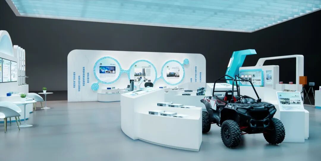 坪山展区以“登峰向新”为设计理念,构建兼具美感与内涵的展陈空间。主色调“科技蓝”,既彰显科技属性,更寓意坪山在新质生产力浪潮中向新而行、勇攀高峰的奋进姿态。展区整体以“创新攀登、向未来生长”为视觉核心,设计里藏着巧思——巧妙融合“车、药、芯、智”四大主导产业的形态与结构美学,走进展区就像闯进未来科技空间,开放又有跃升感,“创新坪山”张力扑面而来。