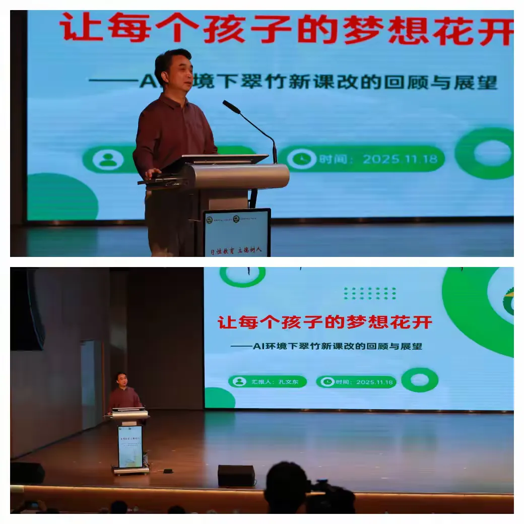 随后的主题讲座环节,四位专家从不同维度带来了前沿思考。深圳市翠竹教育集团总校长孔文东分享了AI环境下的课改探索;南京市中山小学校长庄永洲阐述了学校文化品牌建设的实践智慧;深圳大学教育学部副主任曹晓明教授以场景与边界为例,畅谈了生成式人工智能教育应用;最后,习性教育创始人、中山小学教育集团总校长曾宇宁以校歌为切入点,生动诠释了《文化自信引领学生健康快乐成长》。