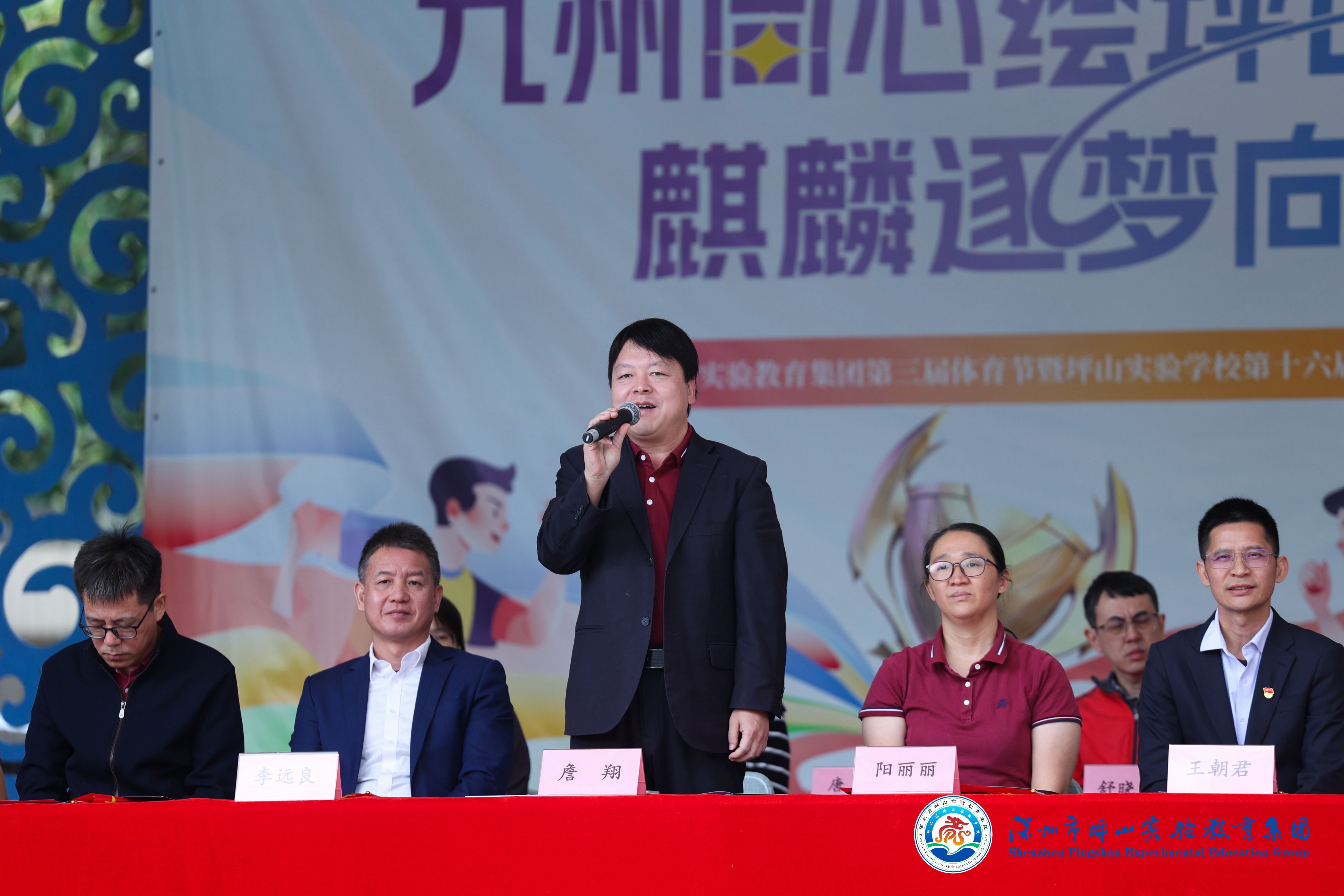 坪山实验教育集团总校长、坪山实验学校党委书记詹翔庄严宣布坪山实验教育集团第三届体育节暨坪山实验学校第十六届麒麟体育节正式开幕。