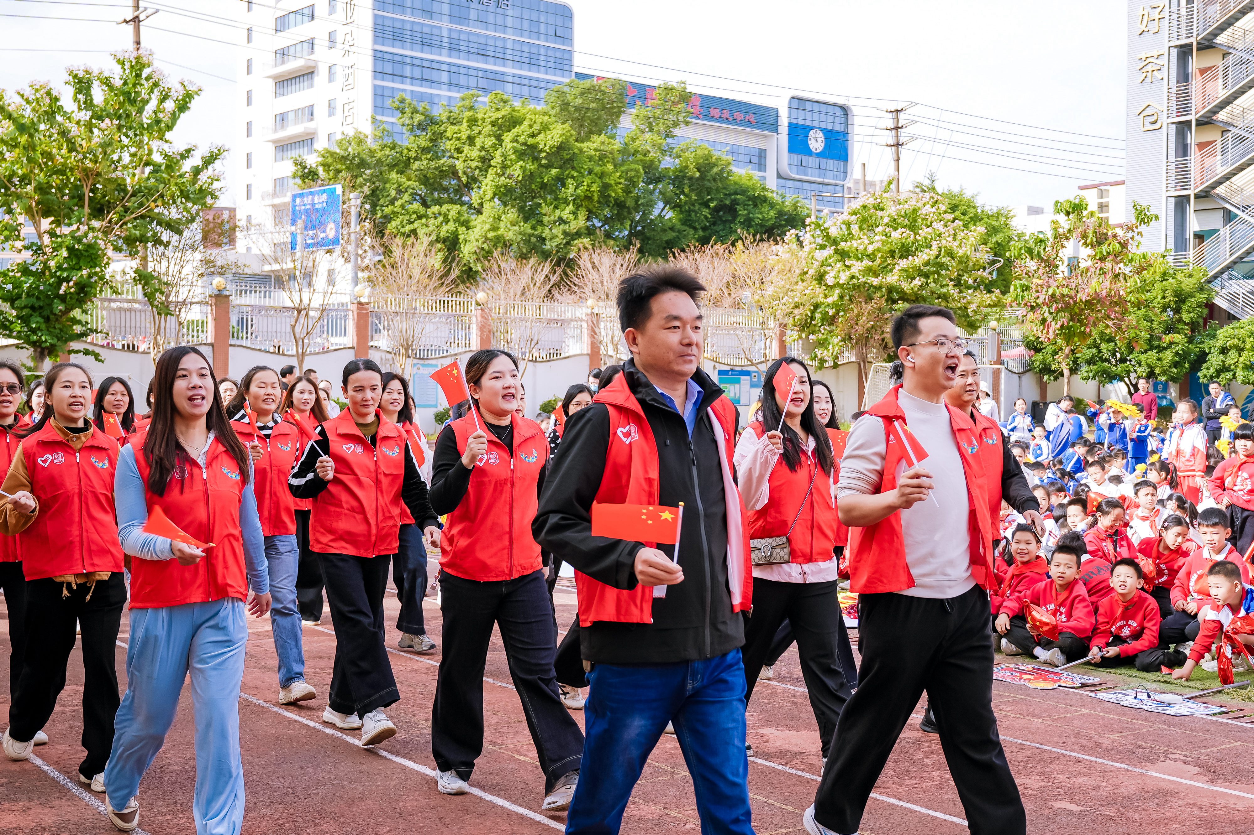 特别引人注目的是家长志愿者方阵,他们身着红色马甲,步伐轻快、笑容温暖。平日里,他们是校园“护航岗”上的守护者,是各类活动中默默奉献的身影;今天,他们从“幕后”走向“台前”,与孩子们共同分享运动的快乐,成为赛场上一道温暖的风景线。