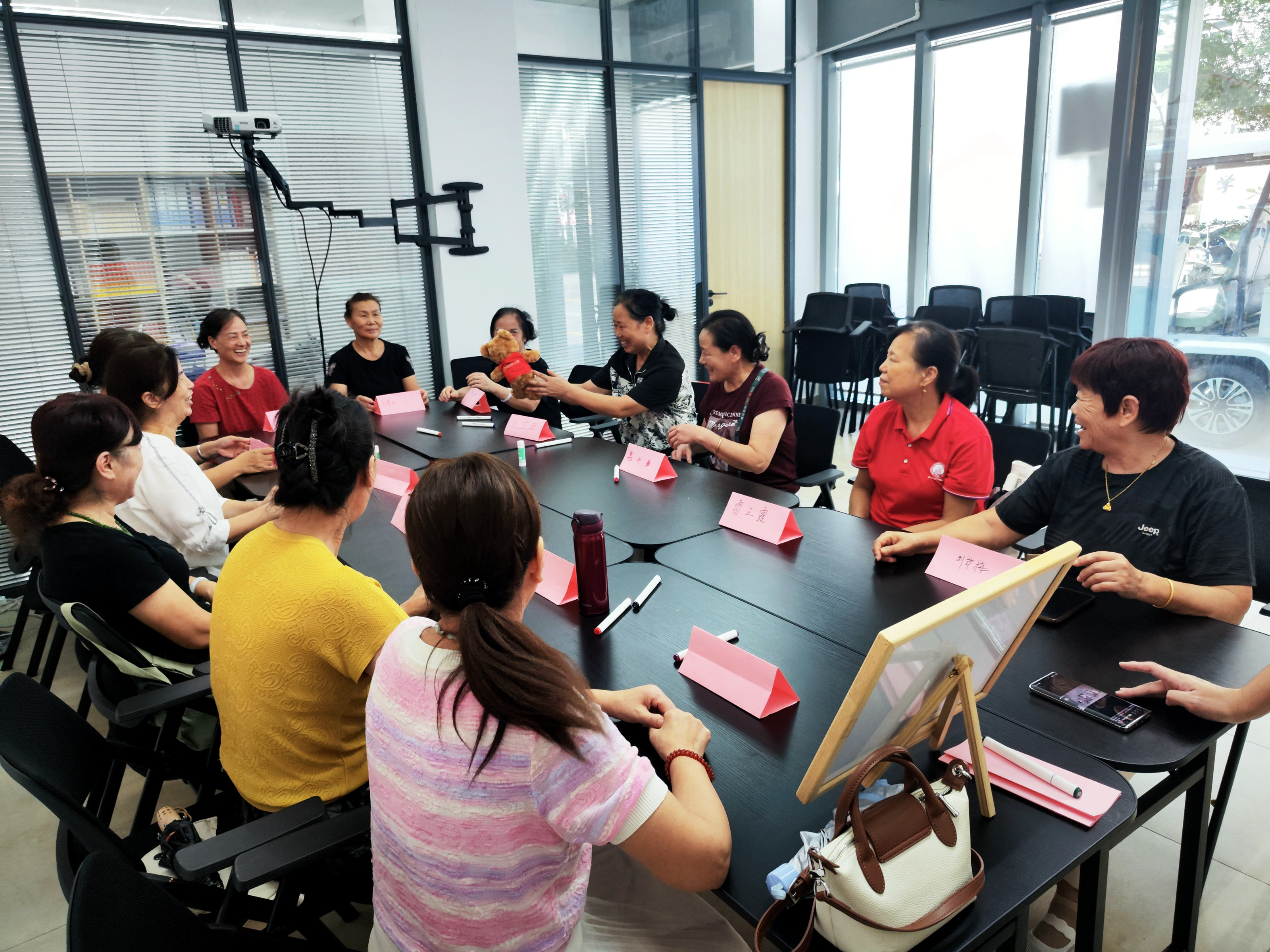 活动以节奏明快的“击鼓传花”游戏热场,吉祥物小熊在长者们手中快速传递。鼓声一停,拿到小熊的长者或唱一段经典老歌,或跳一支欢快舞蹈,现场掌声与笑声不断,原本陌生的面孔迅速熟络起来。随后的“制作名牌”环节,大家认真书写姓名、佩戴专属名牌。“有了这个,以后在小区碰到就能叫出名字啦!”彭阿姨举着自制名牌开心地说,小小卡片成了邻里相识的“友谊桥梁”。此外,趣味问答环节巧妙融入社区生活、健康常识等内容展开,长者们在轻松的氛围中学习知识,收获快乐。