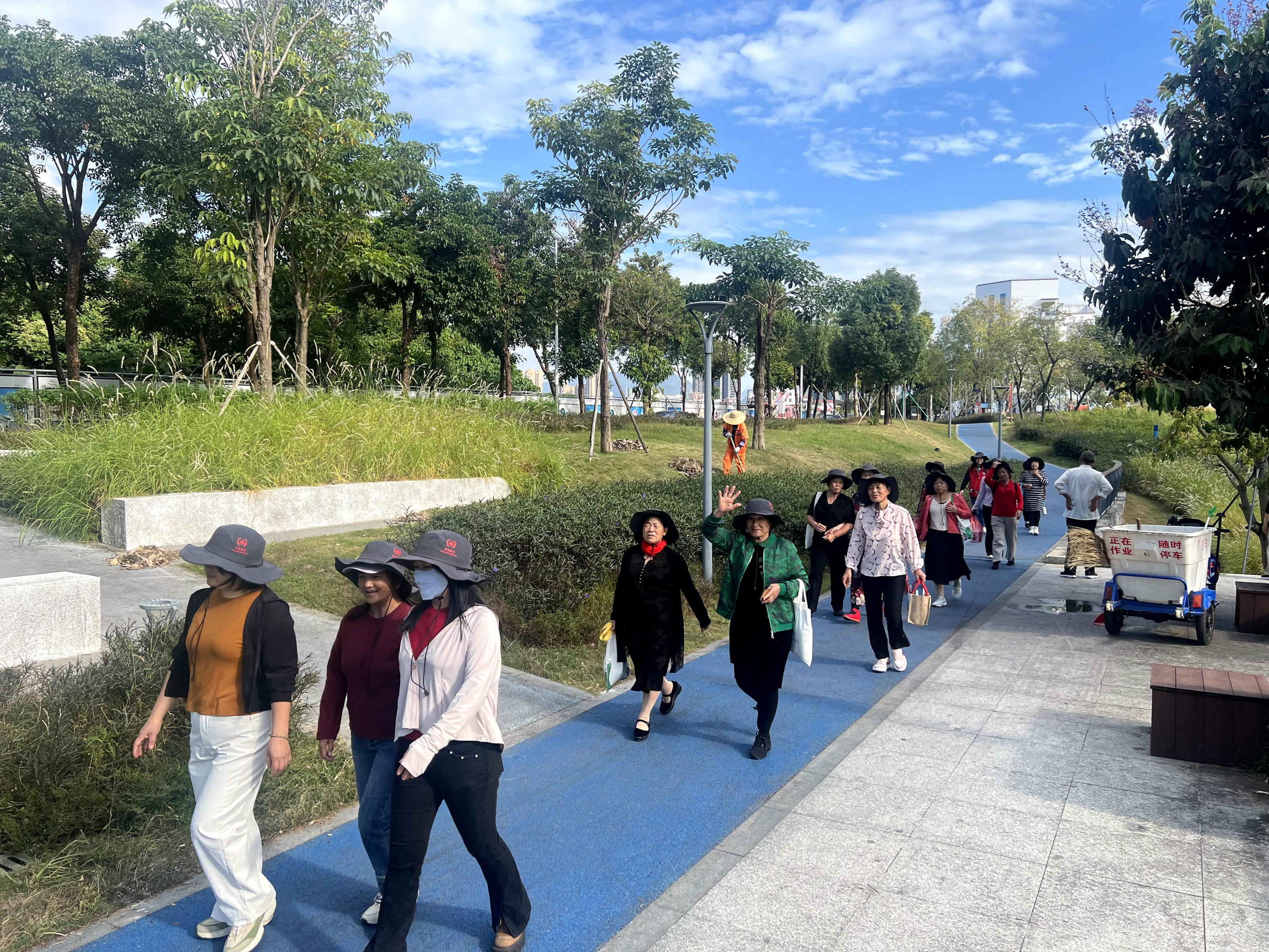 在后续的健步走活动中,社工带着长者们沿着碧道漫步前行,形成一道亮丽的风景线。大家三五结伴,或交流八段锦练习心得,或畅谈社区变迁,或即兴唱起《歌唱祖国》《映山红》等经典老歌,欢声笑语回荡在碧道上空。持续参与活动的银龄志愿者李阿姨表示:“能作为志愿者教大家八段锦,让我感到实现了新价值。看到老姐妹们认真学习的样子,我也特别开心!”