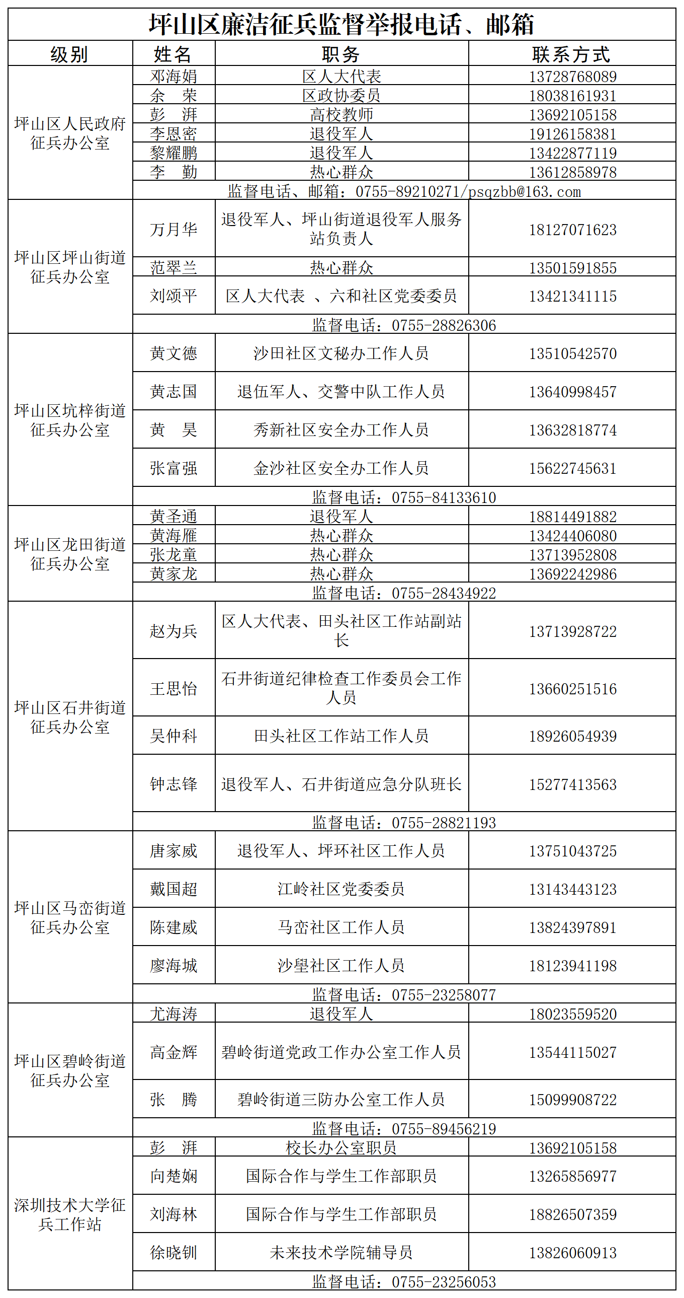 你们好!依法服兵役是每个适龄青年的应尽义务,参军报国是每名有志青年的光荣选择,坪山是东江纵队发源地,东纵司令曾生的故里,享有“华南小延安”的美称,区征兵办向全区广大应征青年踊跃报名参军表示热烈欢迎!