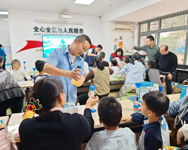 活动现场,讲师以“一滴水的奇幻旅程”的故事,结合水质净化厂动漫宣传片,生动展现污水处理全过程,并与亲子家庭展开问答互动,现场氛围热烈。随后在实践环节中,16对亲子家庭在水务工作人员及党群社工的指导下亲手操作小型净化装置,近距离感受污水“蜕变”的过程,当看到浑浊的污水经过层层过滤逐渐变得清澈透明时,孩子们眼中闪烁着惊奇的光芒,兴奋的欢呼声此起彼伏。“和孩子一起动手做实验,让我们全家对节水护水有了全新的认识。”涵涵妈妈表示。