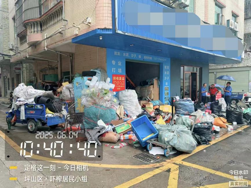 据悉,该处市容“顽疾”已存在数月。在吓榨新村一家临街店铺前,店主年过六旬的父亲长期违规堆放大量废旧物品,不仅超出门店经营线、侵占公共通道,更因紧邻社区篮球场、沙湖夜市和车辆出入口,既破坏市容整洁,也给夜市运营和居民出行带来安全隐患,成为周边居民反复反映的“烦心事”。