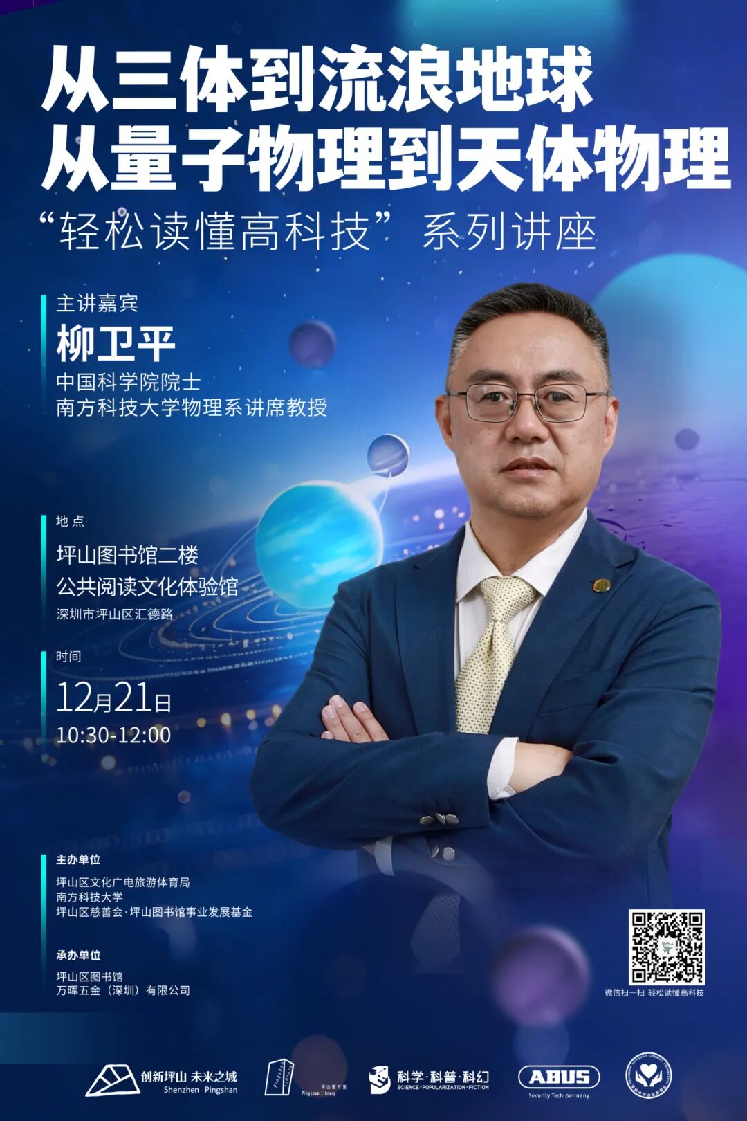 深圳新闻网2025年12月19日讯(记者 杨涛)你是否也曾仰望星空,对《三体》中的“降维打击”充满想象?是否也想揭开《流浪地球》背后那些震撼人心的天体物理奥秘?12月21日,中国科学院院士、南方科技大学讲席教授——柳卫平院士将来到坪山图书馆,带领市民一同推开科幻之门,走进硬核科学的璀璨星空。