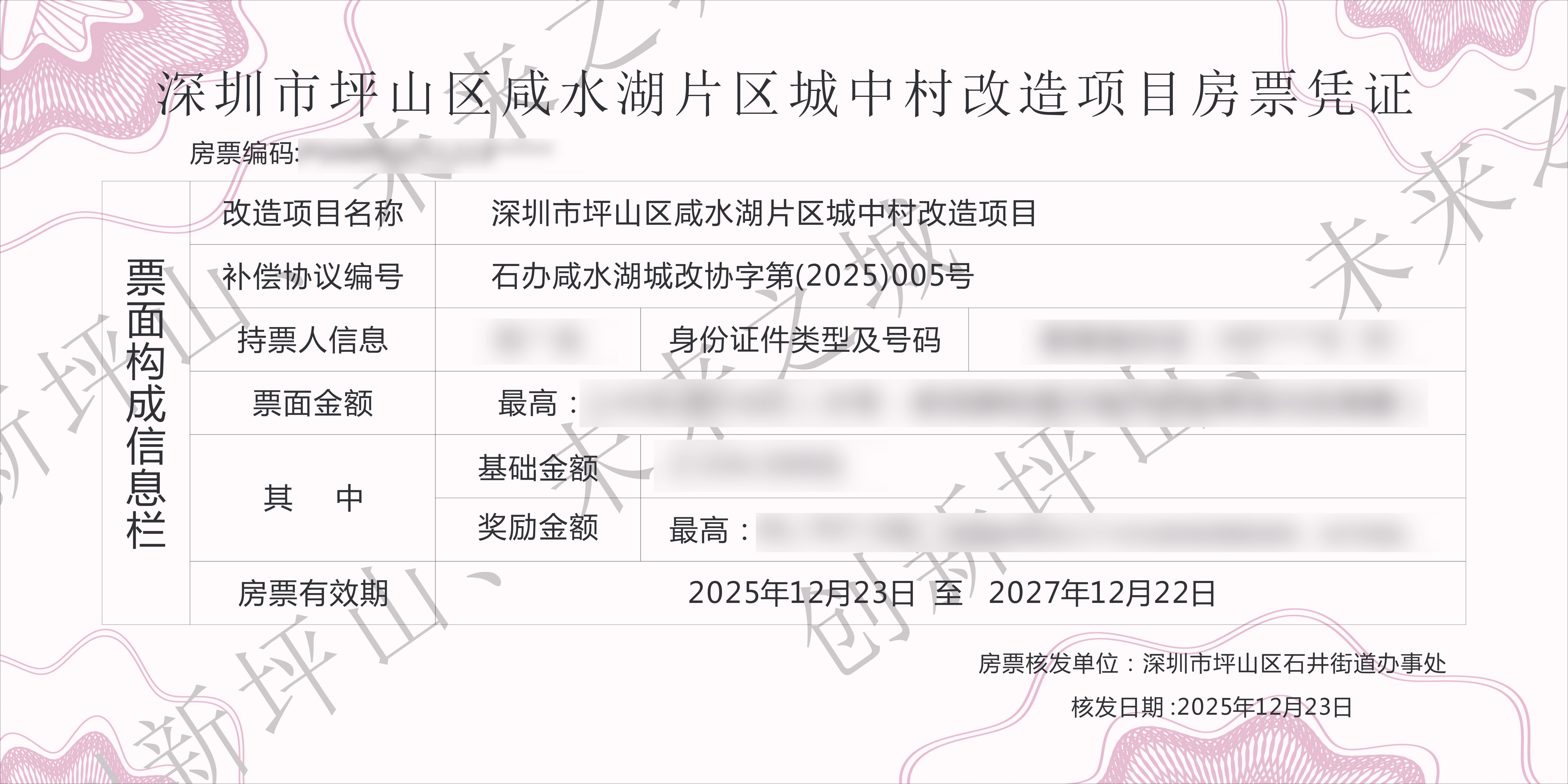 深圳新闻网2025年12月24日讯(记者 杨涛 通讯员 钟琼澳)12月23日,深圳市首个拆除新建类城中村改造项目——坪山区石井街道咸水湖片区城中村改造项目,成功举行集中签约暨房票发放仪式,代表项目一期圆满完成。这标志着坪山区贯彻落实中央城市工作会议精神和《中共中央、国务院关于推动城市高质量发展的意见》,高质量开展城市更新迈出坚实步伐;也标志着石井街道大力推进城中村改造,创新实施房票安置,探索补偿安置路径多元化取得实际成效。深圳市住建局、坪山区政府以及区住建局、区城市更新和土地整备局、石井街道办事处、石井股份公司代表、业主代表等出席仪式。